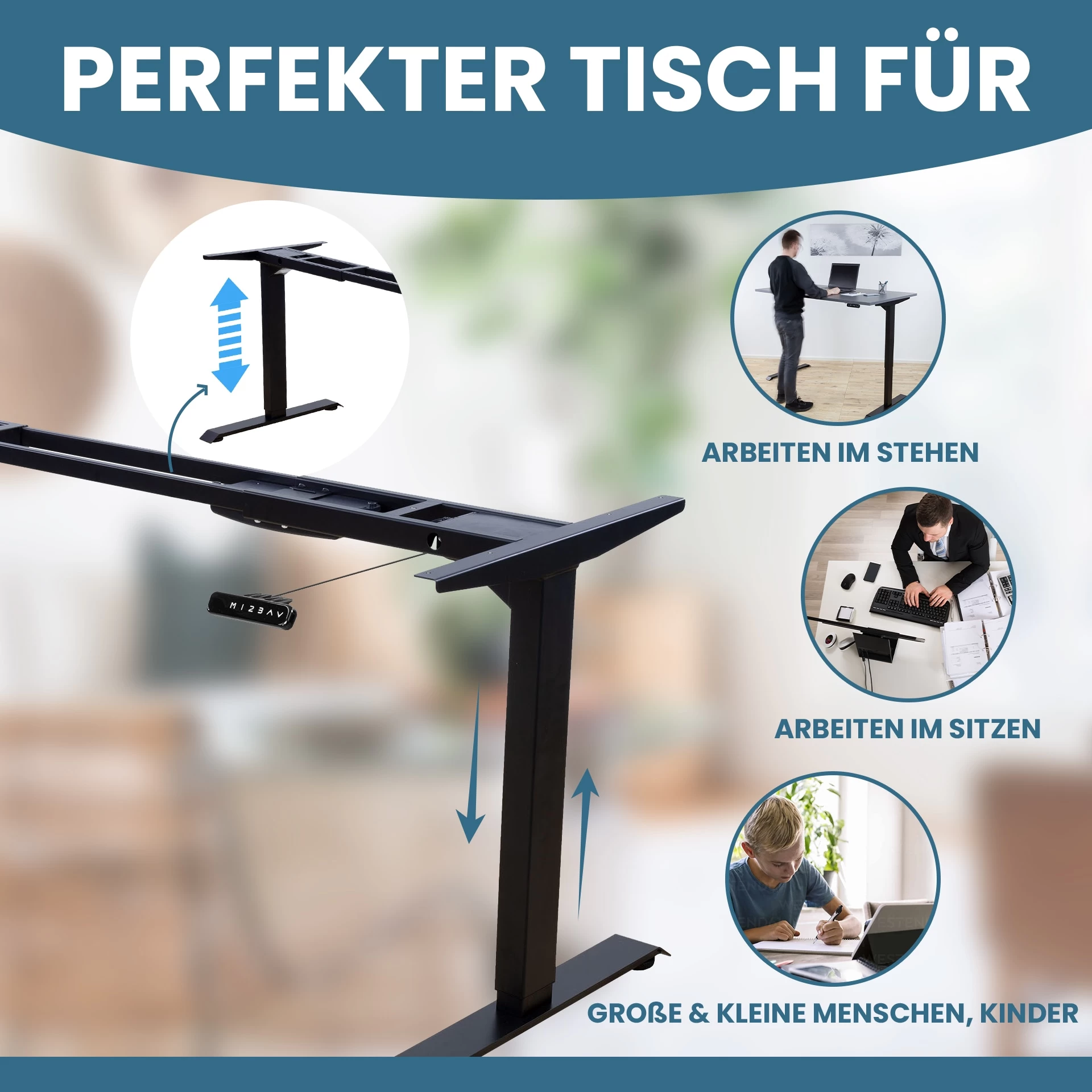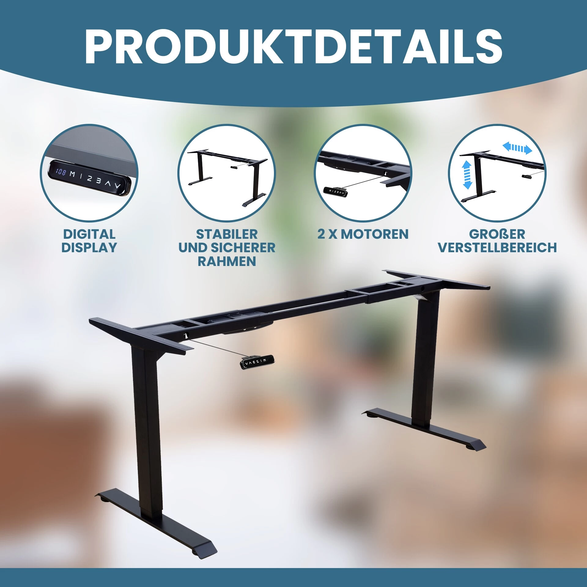 - NÜTZLICHE FEATURES: Das Schreibtisch-Gestell besitzt ein Digitaldisplay und eine Speicherfunktion von bis zu 3 individuellen Höhen. Außerdem sind ein Anti-Kollisionssensor und Kindersicherung verbaut.