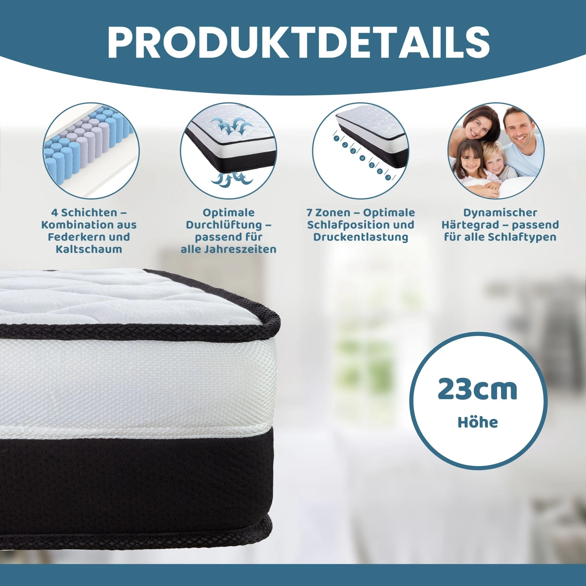 - ? 4 SCHICHTEN + 7 ZONEN FÜR OPTIMALEN SCHLAF: Die Matratze EMILIA besteht aus einem innovativen Mix von 4 Schichten (Klimafaser versteppt mit Doppeltuch, Kaltschaum, Komfortschaum, Taschenkernfedern). Die Aufteilung in 7 Zonen sorgt für optimale Anpassung der Bereiche Schultern, Lenden, Becken und Wirbelsäule – perfekt für einen gesunden und erholsamen Schlaf. Gesamthöhe 23cm.