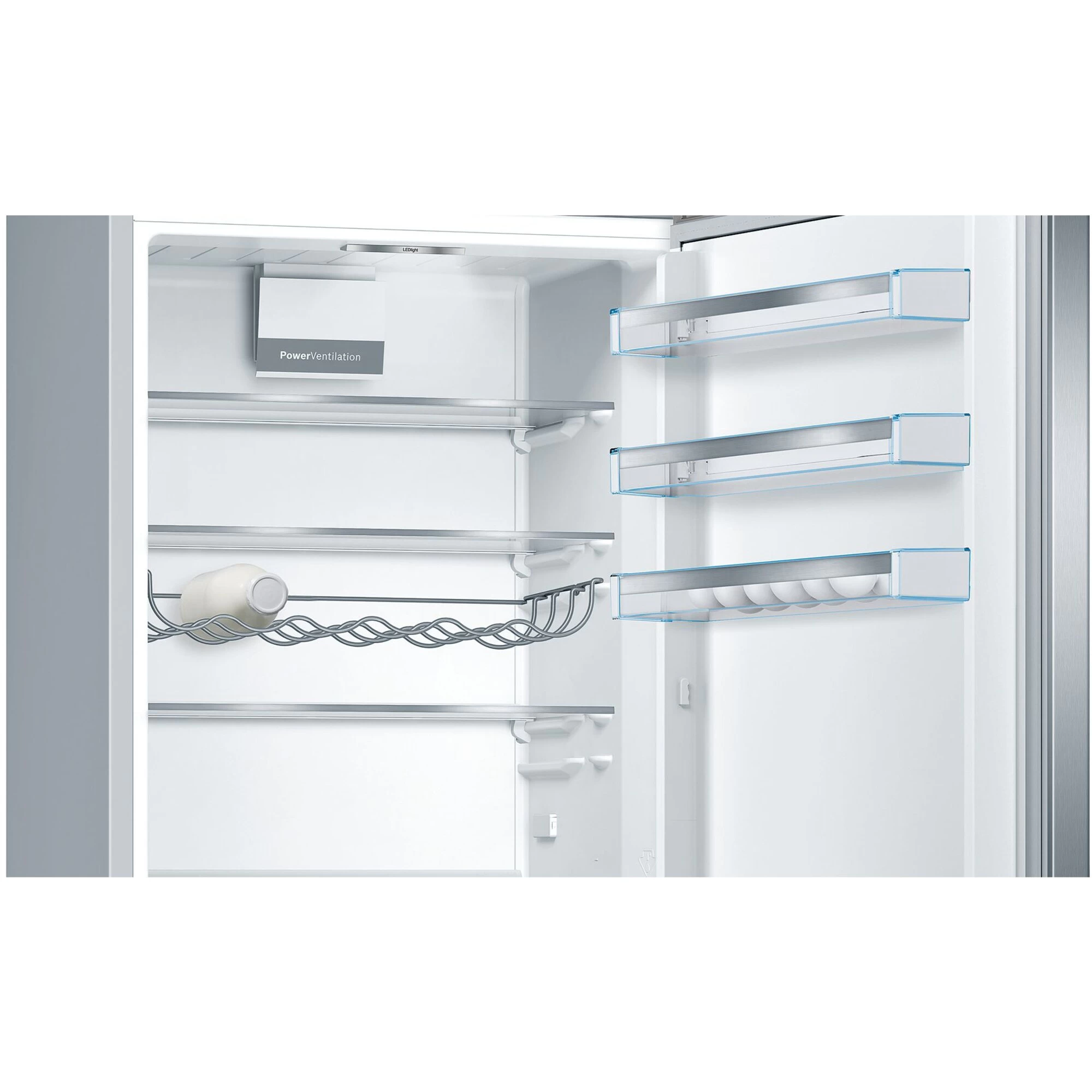 Die Kühl-/Gefrierkombination Bosch KGE49AICA ist mit einem Gesamtnutzinhalt von 419 Litern ideal für den großen Haushalt geeignet. Der 302 Liter große Kühlraum stellt fünf Abstellflächen aus Sicherheitsglas, davon zwei höhenverstell- und vier ausziehbar (EasyAccess Shelf), ein glanzverchromtes Flaschenrost sowie drei Türfächer zur Verfügung. In der VitaFresh 0°C Schublade bleibt Fisch und Fleisch länger frisch und die VitaFresh Schublade auf Rollen mit Feuchtigkeitsregulierung ist perfekt für die Lagerung von Obst und Gemüse geeignet. Der Gefrierbereich umfasst 117 Liter und ist mit drei transparenten Gefriergutschubladen, davon eine BigBox für größeres Gefriergut, ausgestattet. LowFrost reduziert die Eisbildung sodass man den Gefrierraum seltener abtauen muss. Darüber hinaus überzeugt die KGE49AICA mit einer SuperKühlen-Funktion sowie einer Urlaubsschaltung. Die Temperaturregelung erfolgt mittels TouchControl und ist digital ablesbar. Mit einem Stromverbrauch von 163 kWh im Jahr ist die KGE49AICA in die Energieeffizienzklasse C eingestuft.