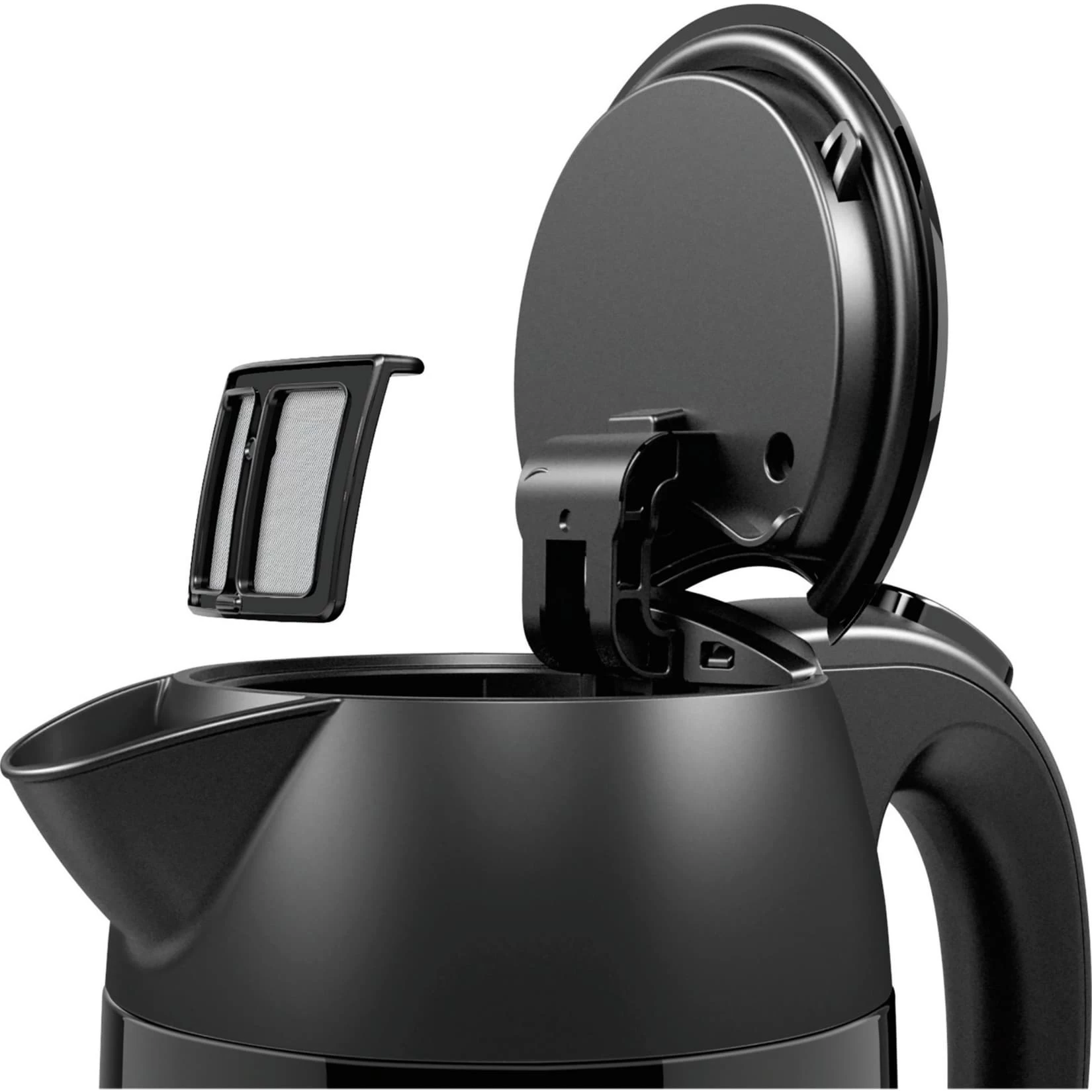 Leistung in ihrer schönsten Form. Bei dem DesignLine Wasserkocher TWK3P423 trifft zeitloses Design auf hohen Bedienkomfort. Eine leicht ablesbare Wasserstandsanzeige mit Tassenanzeige hilft dabei Zeit und Energie zu sparen, indem man immer nur die benötigte Menge kocht. Die Bedienung ist intuitiv und komfortabel durch die Deckelöffnung auf Knopfdruck. Der Ausgießer wurde für optimales Ausgießen ohne Verschütten und Spritzen entwickelt. Für Sicherheit sorgen die Abschaltautomatik, Trockengeh- und Überhitzungsschutz sowie Lift-Switch-off.