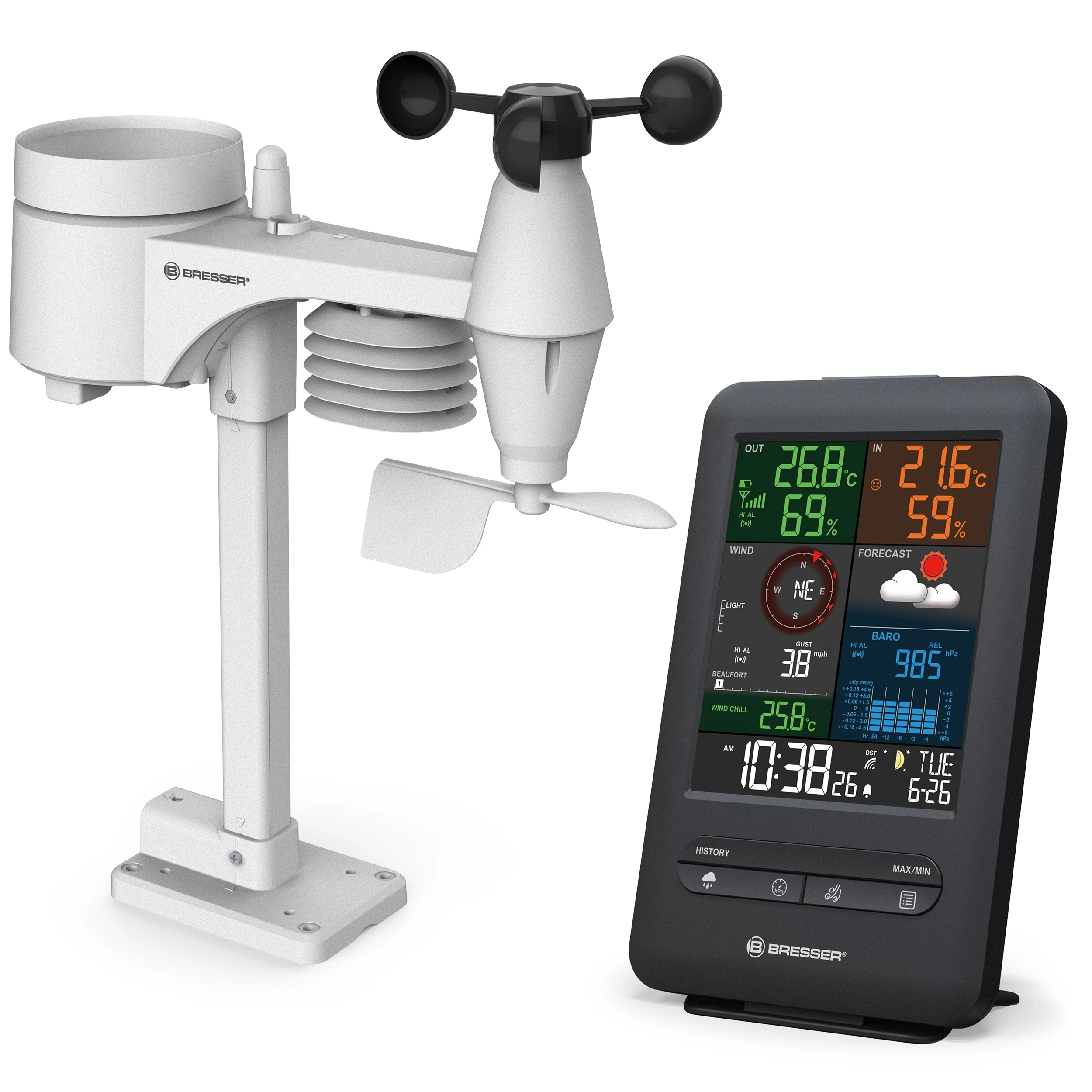 Holen Sie sich mit der BRESSER Wetterstation 5-in-1 Beaufort Ihren farbenfrohen Überblick über Wetter und Zeit.