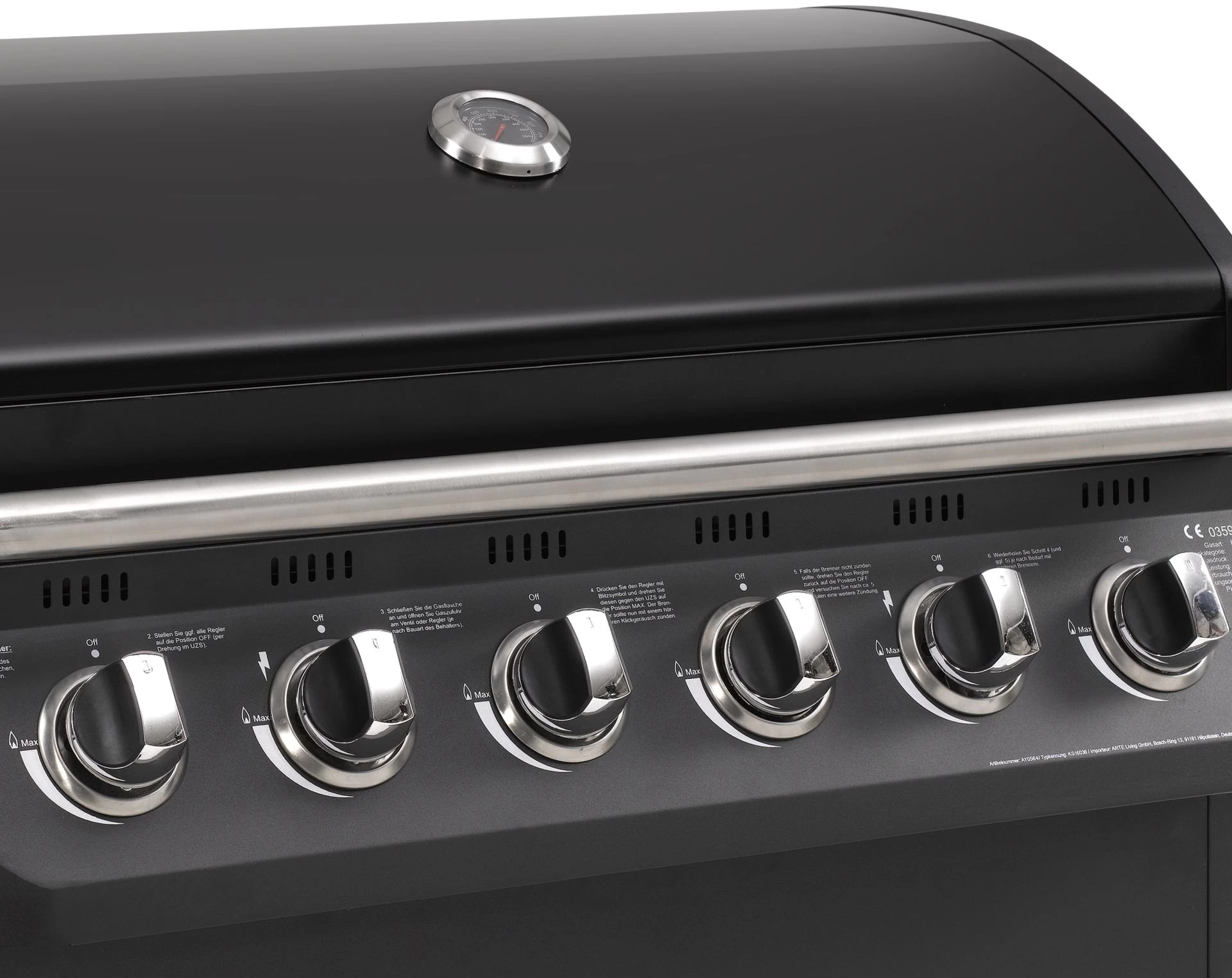 - Gasverbrauch: ca. 1506 g/h (6 Hauptbrenner je 209 g/h + 1 Seitenbrenner 250 g/h)