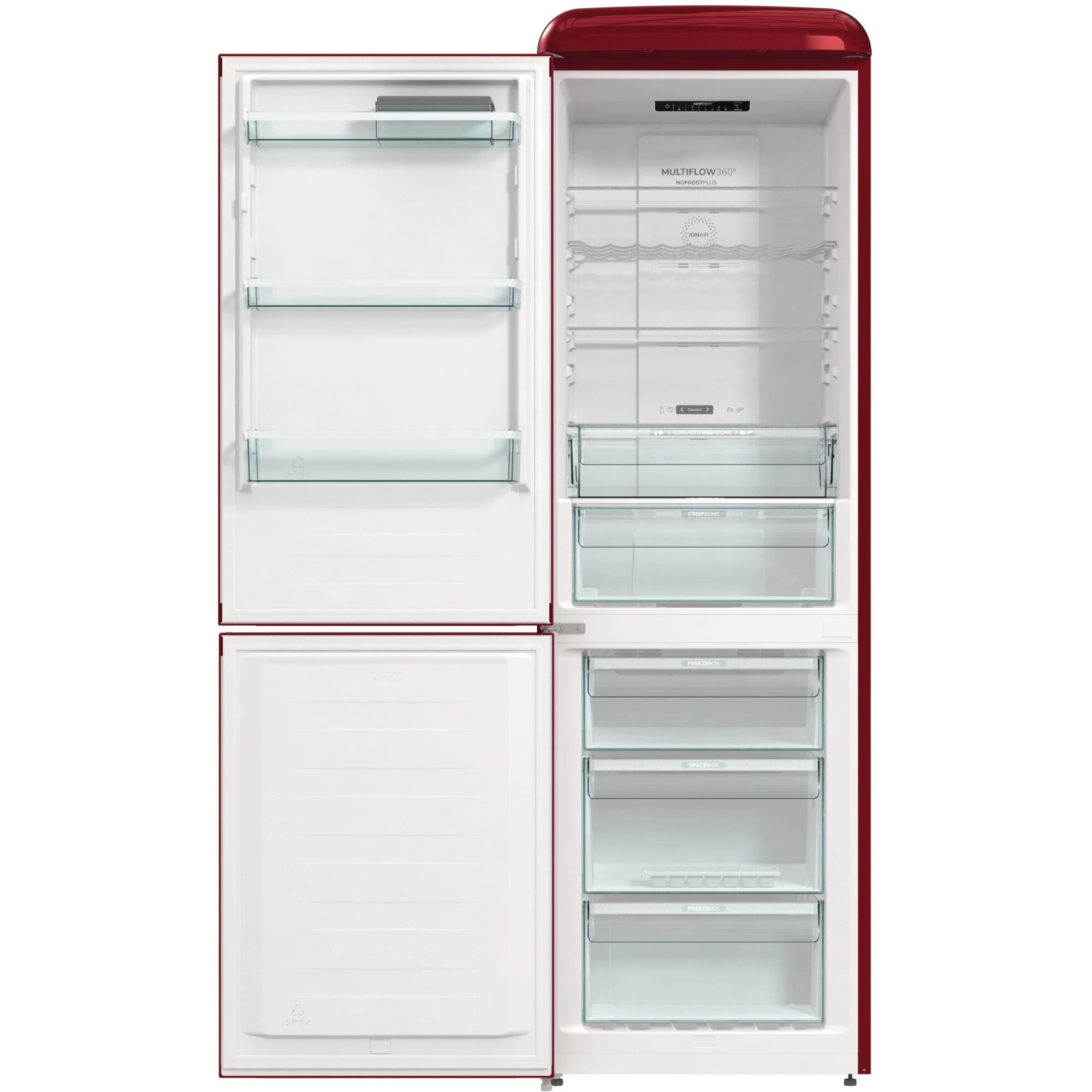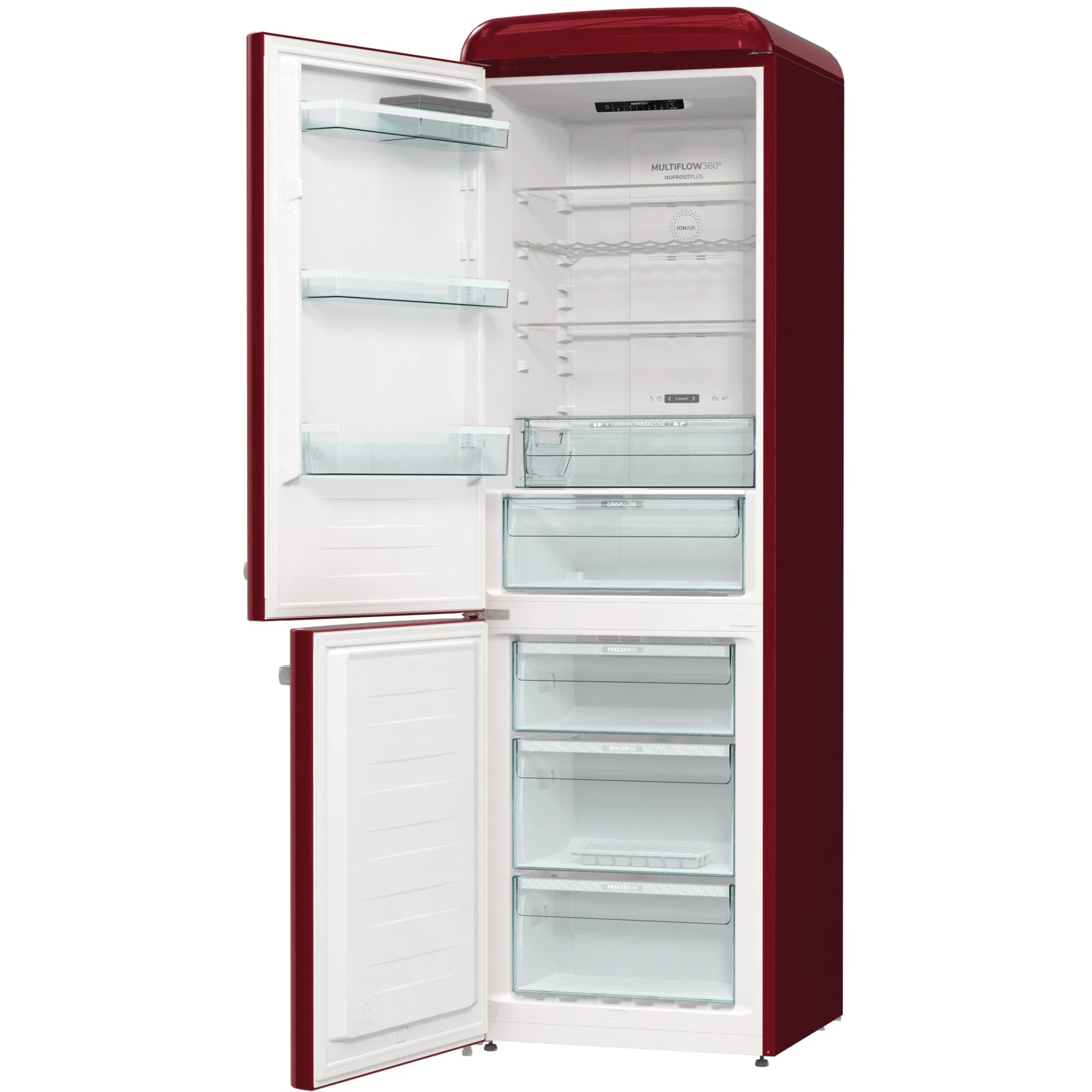 Der Kühl-/Gefrierkombination gorenje ONRK619DR-L ist mit einem Gesamtnutzinhalt von 300 Litern ideal für den mittelgroßen Haushalt geeignet und ist mit ihrem stilvollen Design einen echter Hingucker in der Küche. Der 204 Liter umfassende Kühlbereich verfügt über drei Glasabstellflächen, davon zwei höhenverstellbar, ein Flaschengitter, eine CrispZone mit Feuchteregler für Obst und Gemüse, eine Convert FreshZone, in der wahlweise Fisch und Fleisch oder Obst und Gemüse gelagert werden kann, sowie drei Türfächer. Im Gerät generierte Negativ-Ionen sorgen kontinuierlich für frische und sauerstoffhaltige Luft und das MultiFlow 360° Luftzirkulationssystem verteilt die ionisierte Luft über 14 Luftkanäle für eine gleichmäßige Temperatur im gesamten Kühlraum. Der Gefrierbereich der ONRK619DR-L umfasst 96 Liter und ist mit drei Gefrierschubladen, davon eine BigBox für größeres Gefriergut, ausgestattet. NoFrostPlus verhindert die Eisbildung im Gefrierraum, um den Energieverbrauch niedrig zu halten, während es im Kühlraum für ein ideales Mikroklima für frische Lebensmittel sorgt. Darüber hinaus bietet die ONRK619DR-L eine FastFreeze-Funktion für das schnelle Einfrieren frisch aufgefüllter Vorräte. Mit einem Stromverbrauch von 192 kWh im Jahr ist die ONRK619DR-L in die Energieeffizienzklasse D eingestuft.