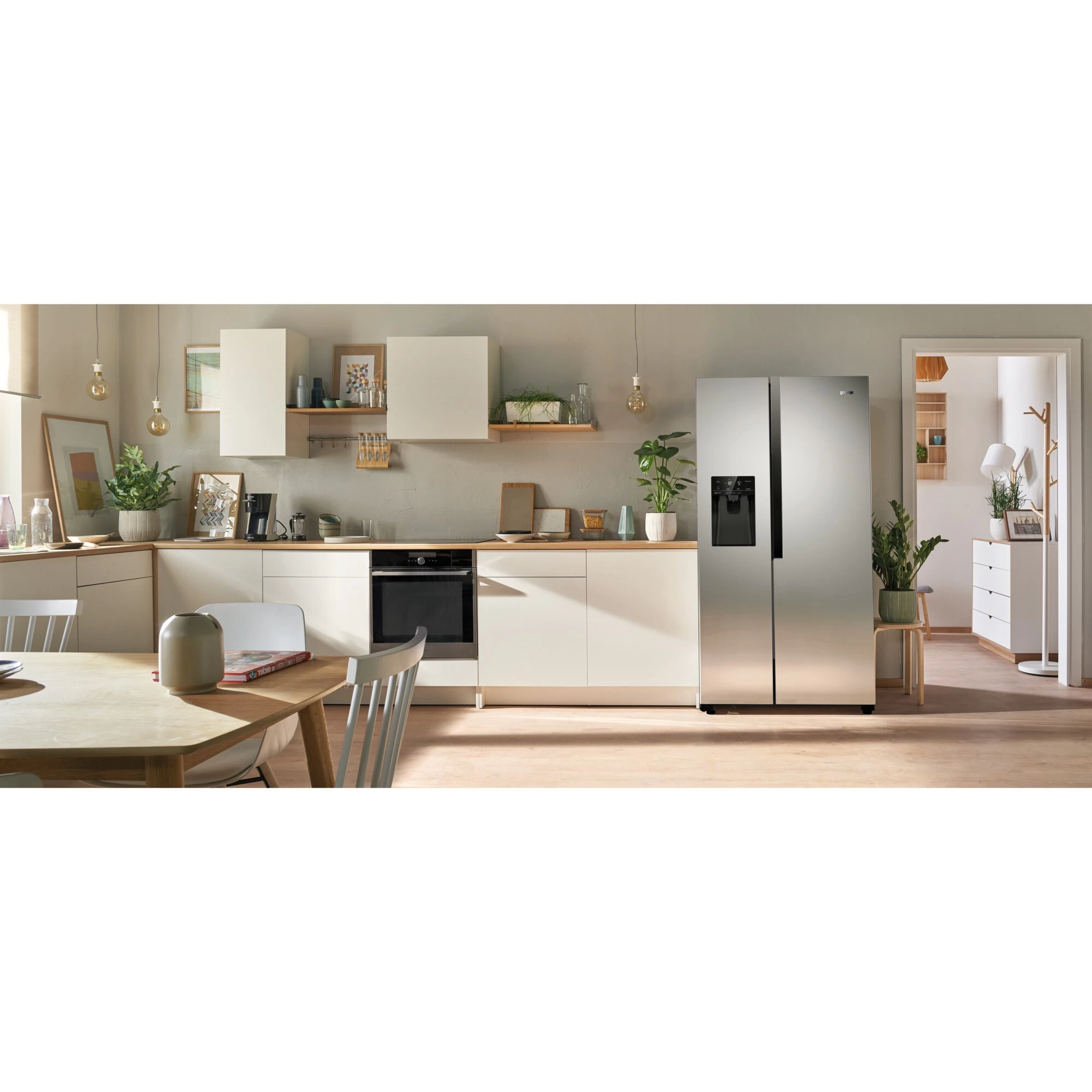 Der Side-by-Side gorenje NRS9182VX ist mit einem Gesamtnutzinhalt von 562 Litern optimal für den großen Haushalt geeignet und überzeugt mit diversen Features. Im 371 Liter umfassende Kühlteil mit Multi-Airflow-System haben Lebensmittel auf fünf Glasabstellflächen, in zwei Obst-/Gemüseschubladen sowie in vier Türfächern jede Menge Platz um übersichtlich gelagert zu werden. Das Gefrierteil mit NoFrost-Technologie gegen Eis- und Reifbildung umfasst 191 Liter und ist mit zwei transparenten Gefriergutschubladen, fünf Glasabstellflächen und drei Türfächern ausgestattet. Auch ein IceMaker mit Wasserspender steht zur Verfügung und die Funktionen FastFreeze und SuperCool sorgen für zusätzlichen Bedienkomfort. Die Temperaturregelung des NRS9182VX erfolgt intuitiv über das große und übersichtliche LED-Display. Mit einem Stromverbrauch von 323 kWh im Jahr ist der NRS9182VX in die Energieeffizienzklasse E eingestuft.
