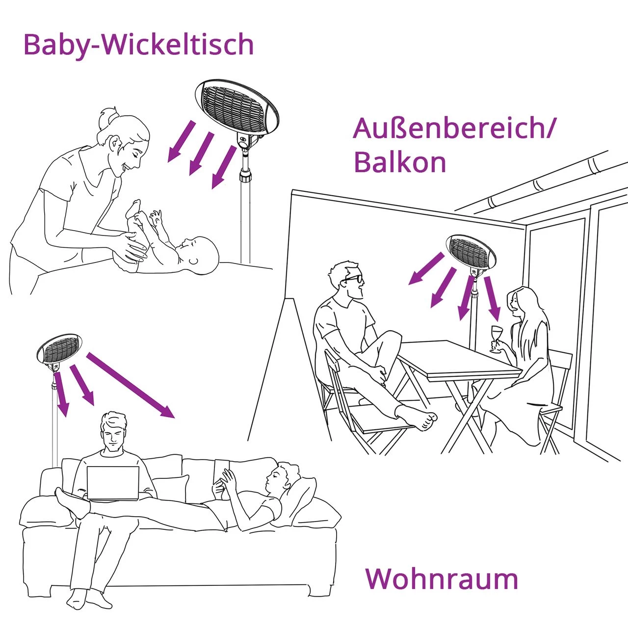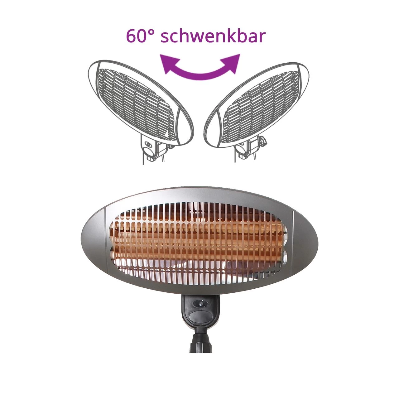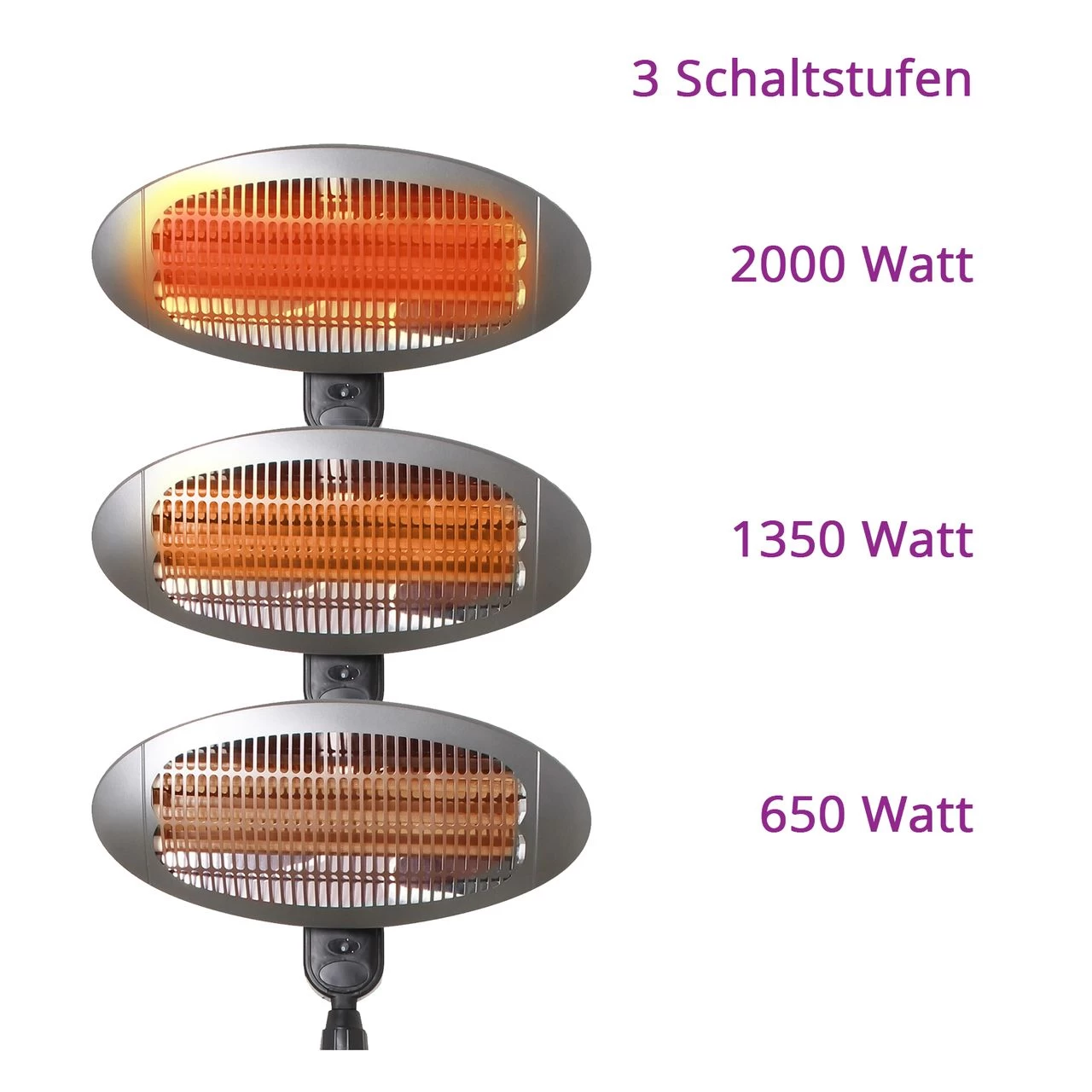 Die drei Quarz-Heizstäbe sind zuschaltbar, sodass 3 mögliche Wärmestufen erreicht werden können. Eine Sicherheitsabschaltung schützt bei Überhitzung oder Umfallen.