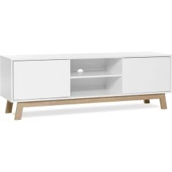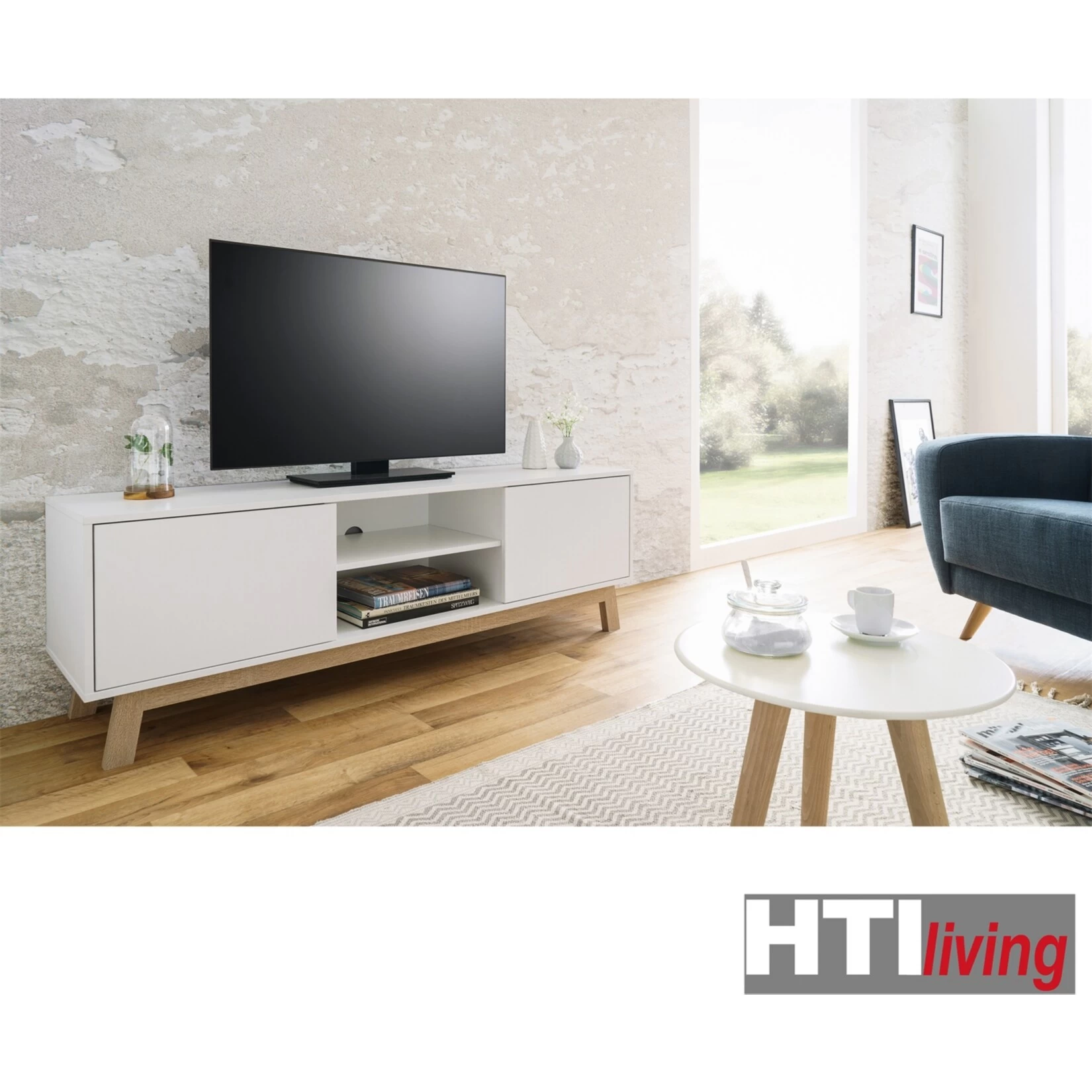 Formschönes TV Board mit Sockel in Echtholz-Design (MDF). Fronten mit Dachschräge zum Hintergreifen. MDF Sockel auf Sonoma Eiche gebeizt, mit abgeschrägten Beinen.