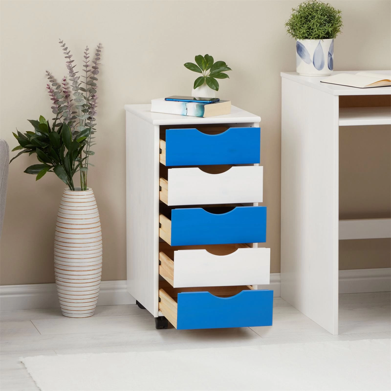 bringt Ordnung ins Kinder- und Jugendzimmer oder ins Büro. Der aus massiver Kiefer gefertigte Bürocontainer ist mit 5 Schubladen sowie 4 Doppelrollen ausgestattet und bietet viel Stauraum für Hefter, Schreib- oder Lernmaterial. Der Rollwagen aus lackiertem Massivholz passt sich optimal in den vorhandenen Einrichtungsstil ein und verzaubern das Ambiente durch seine Natürlichkeit.