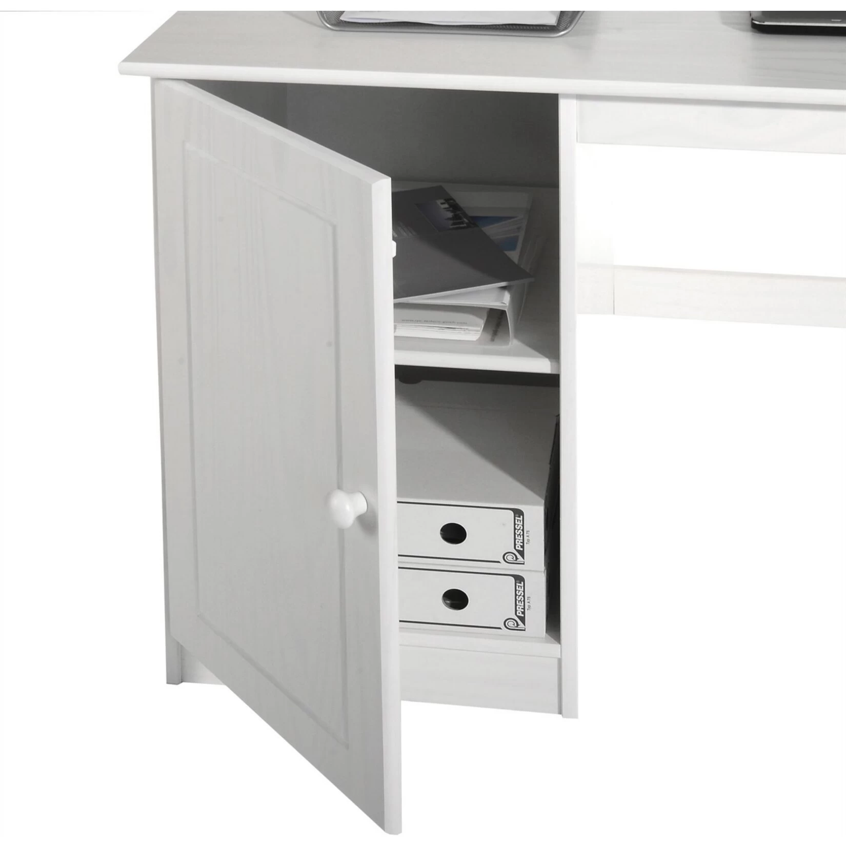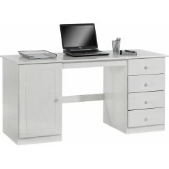 aus Massivholz bringt Ihnen Stabilität und Nachhaltigkeit ins Haus. Denn das Kiefernholz ist pflegeleicht und stabil zugleich und strahlt eine natürliche Wärme aus. Sie werden sich an Ihrem Arbeitsplatz und an diesem Schreibtisch wohl fühlen und angenehme Arbeitszeit haben. Zum Verstauen vieler Kleinigkeiten bieten die vier Schubladen sowie das große Fach hinter der Tür viel Platz.