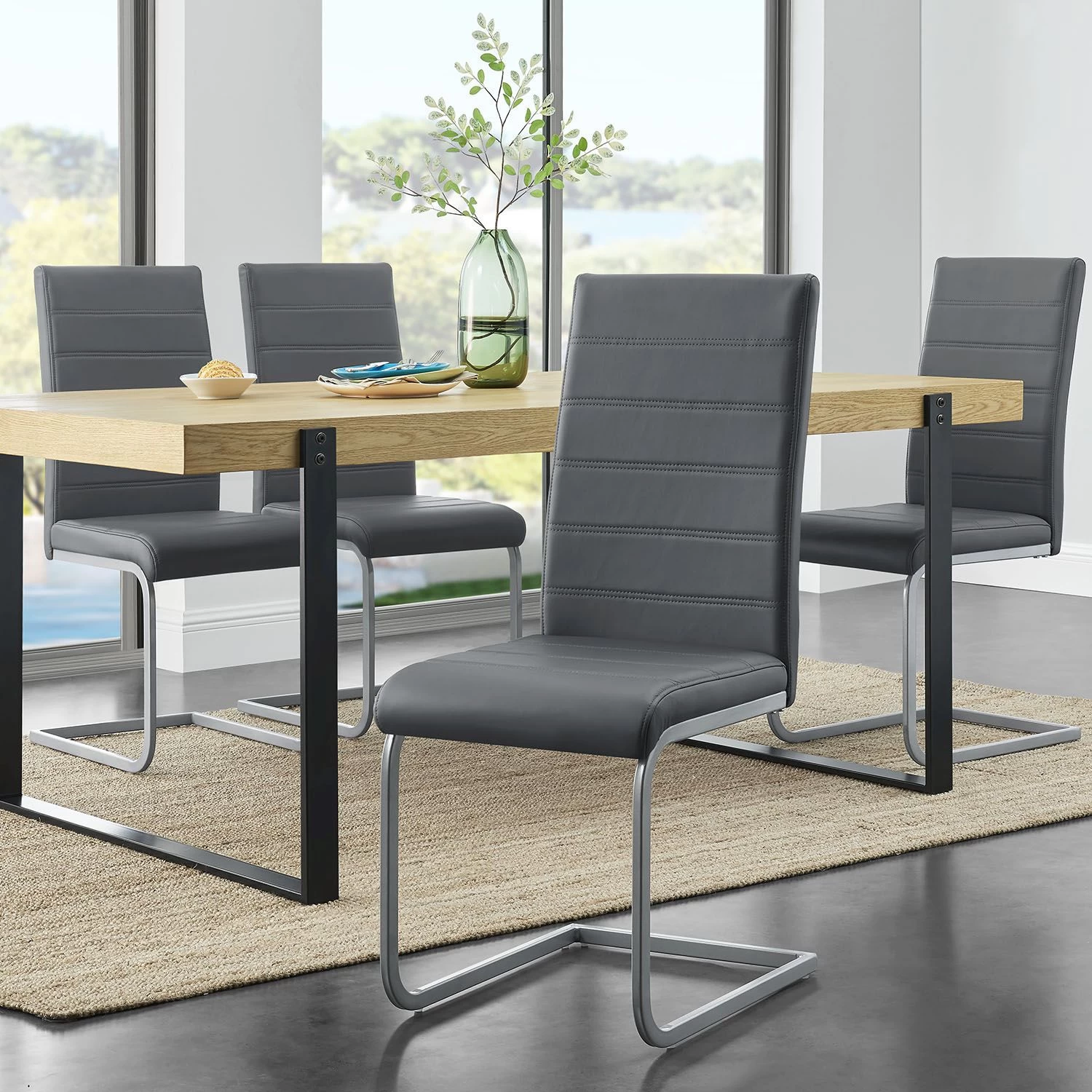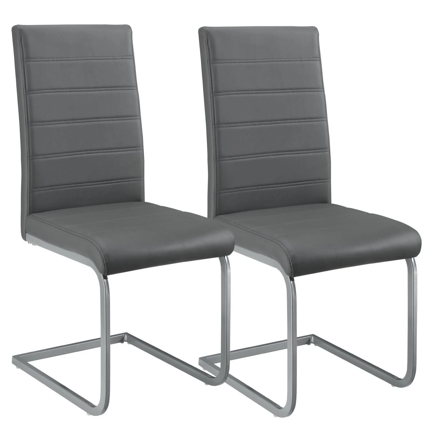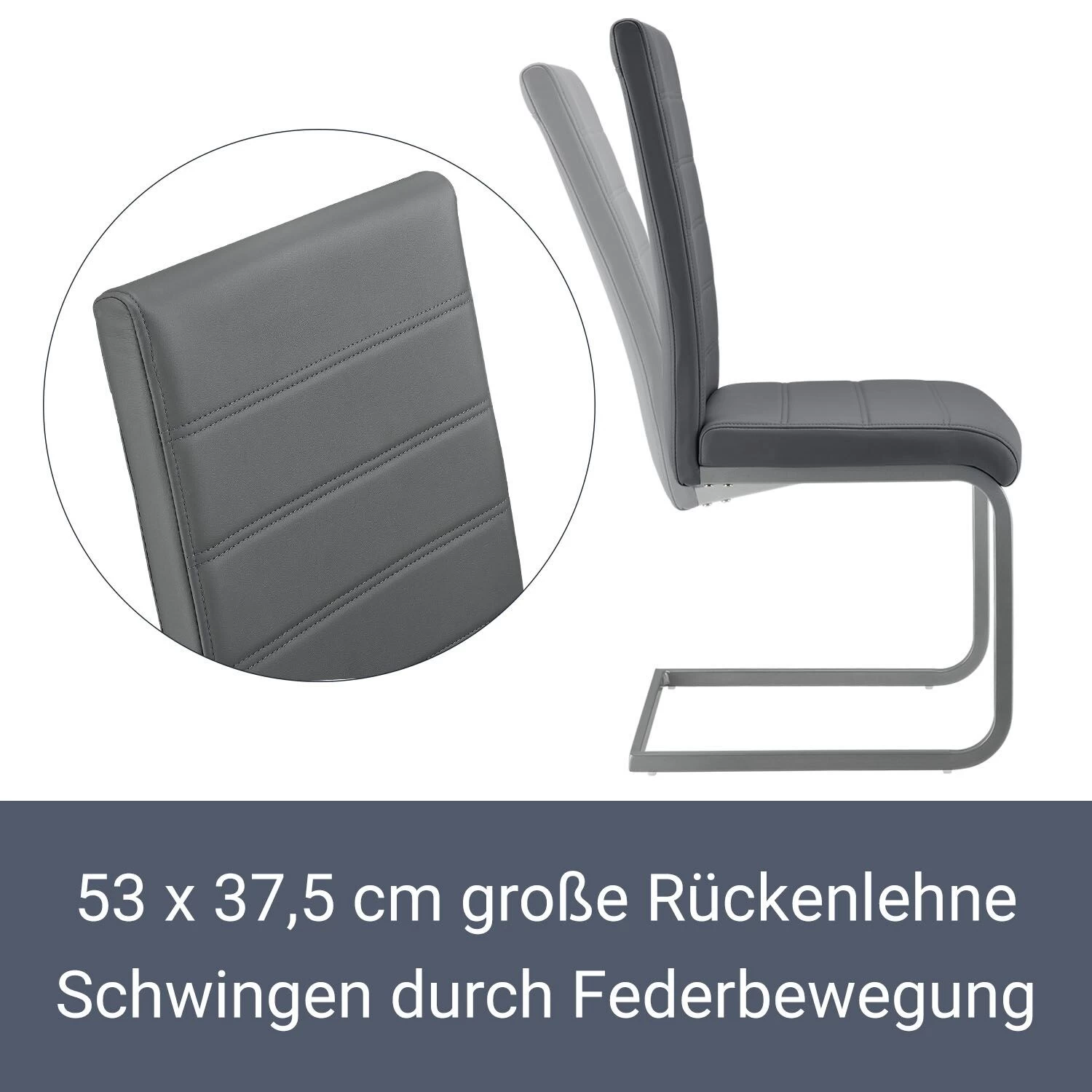 Sie möchten beim Sitzen leicht schwingen? Mit Körperdruck bringen Sie das 2er-Set Freischwinger Stuhl Vegas (Grau) in kleine Schwingungen und beugen so einer steifen Sitzhaltung vor. Verbringen Sie hier gemütliche Stunden mit Ihrer Familie oder Freunden! Gefertigt ist der stabile Esszimmerstuhl aus Metall und weichen Polstern mit Kunstleder-Bezug. Optisch überzeugt der elegante Schwingstuhl in Esszimmer, Küche, Wohnzimmer oder Arbeitszimmer. Mit der schlichten Lederoptik verleihen die modern gestalteten Esstisch Stühle einen stilvollen Charme und zeigen sich überaus pflegeleicht. Das Set ist zudem günstig und schnell aufgebaut.