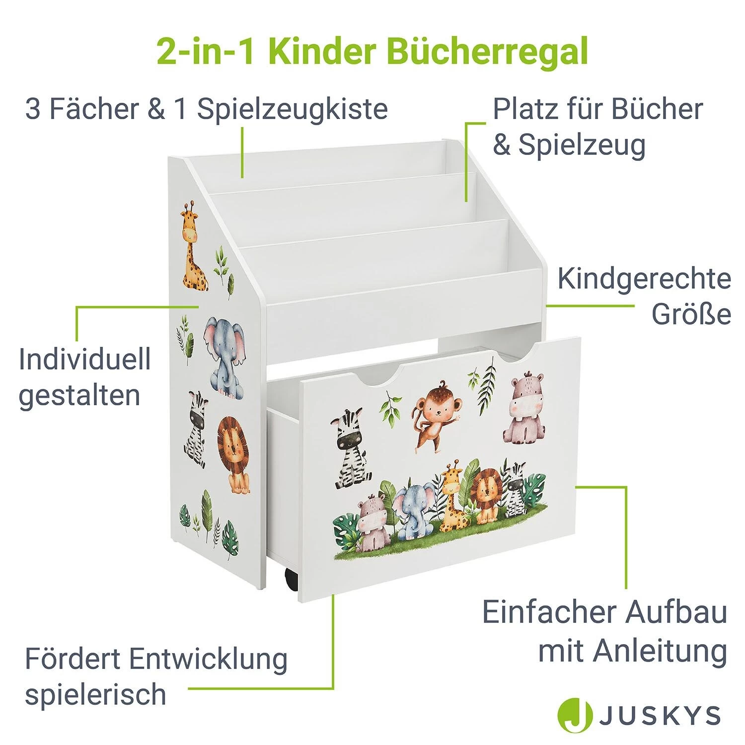 In dem Kinder Bücherregal mit 3 Fächern und herausziehbarer Spielzeugkiste verstauen Sie Kinderbücher und Spielzeug ordentlich. Das stabile Regal aus Holz bringt Ordnung ins Wohnzimmer und Kinderzimmer. Zugleich trägt es spielerisch zur kindlichen Entwicklung bei. An dem Bücherregal für Kleinkinder lernt ihr Nachwuchs den ersten Umgang mit Büchern, sprich das eigenständige Aussuchen und Aufräumen. Durch das Regal sind Bücher stets präsent – wichtig für die Bildung. Zudem begeistern die niedlichen Tiersticker und regen die Fantasie an. Sicherheit bietet die abgerundete Ecke. Alternativ ist der Organizer für Zeitschriften nutzbar.