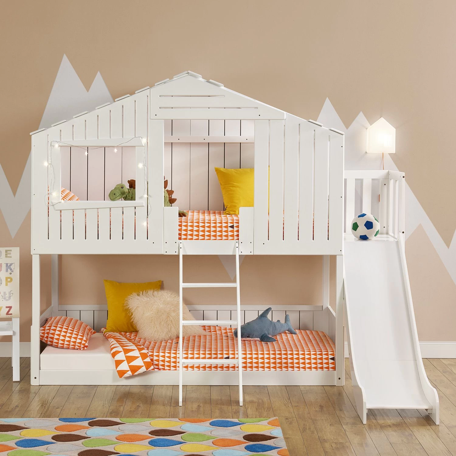 Mit dem trendigen Baumhausbett aus Holz bereiten Sie Ihren Kindern eine große Freude! Denn Kinder lieben gemütliche Baumhäuser und moderne Betten in Hausoptik. Im platzsparenden Design vereint das Hausbett Schlafen und Spielen in einem – ideal für kleine Zimmer. Die beiden 90×200 cm großen Betten mit Lattenrost eignen sich perfekt für Geschwister, Zwillinge und Gäste. Auch als extra Spielbereich werden sie gerne genutzt. Für schöne Momente in der Kindheit lädt die multifunktionale Konstruktion mit Rutsche die Kids zum fantasievollen Spielen ein. Im Design als Haus mit Dach wird das Hochbett schnell zum neuen Lieblingsort Ihrer Kinder.