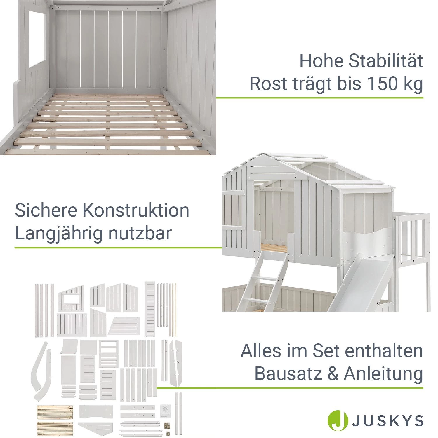 Das multifunktionale Spielbett besticht durch seine Vielseitigkeit. Neben den beiden Betten bietet das Baumhaus mit Rutsche ultimativen Spaß. Es vereint mehrere Funktionen wie Schlafen, Rutschen und ideenreiches Spielen. Hier erleben Kinder tolle Abenteuer! Die große Holzrutsche trägt bis zu 80 kg.