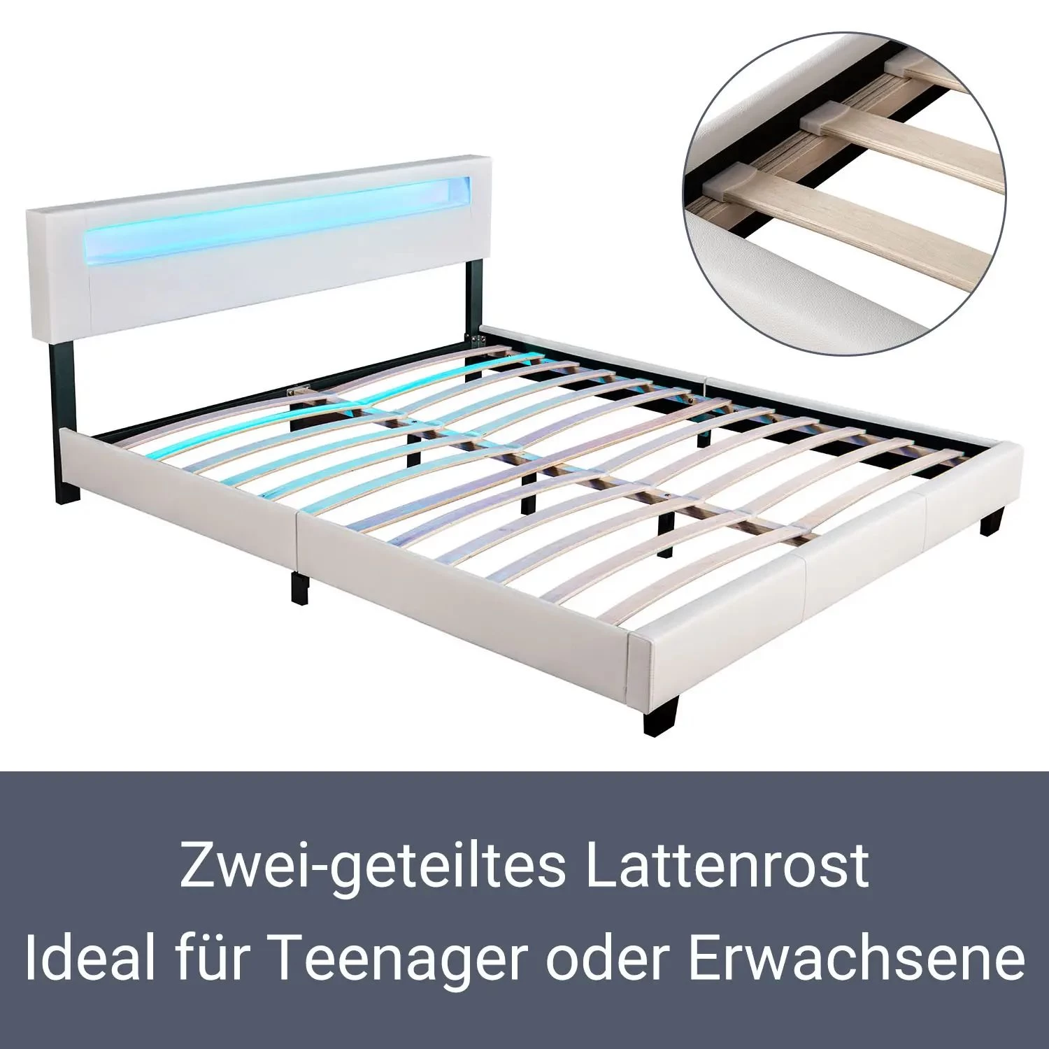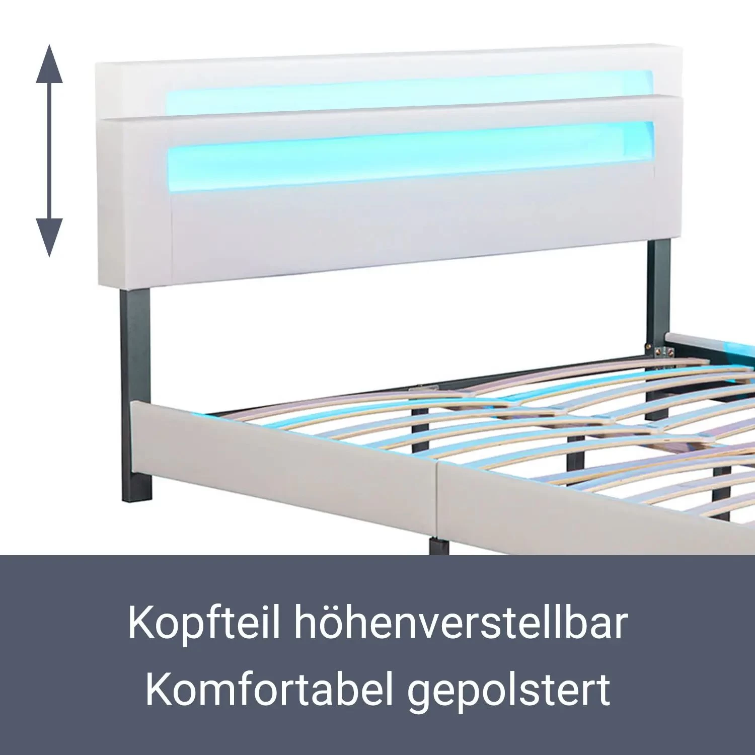 Den Eyecatcher des Kunstlederbettes bildet die im Kopfteil eingebaute LED-Beleuchtung. Mit einer Fernbedienung wählen Sie zwischen 16 verschiedenen Lichtfarben und Helligkeiten aus. Machen Sie Ihr Schlafzimmer bei stimmungsvollem Ambiente und indirekter Beleuchtung zur Wohlfühloase!
