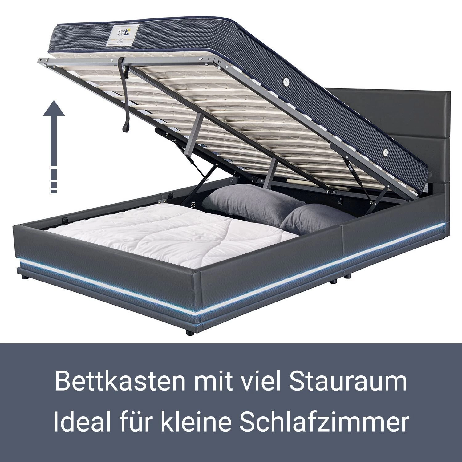 Das LED-Polsterbett Toulouse (180×200 cm, dunkelgrau) ist ein geräumiges Doppel- oder Jugendbett mit Lattenrost, Matratze und viel Stauraum. Auf dem stabilen Lattenrost und der ergonomischen Kaltschaummatratze liegen Sie ideal, um gesund und erholsam zu schlafen. Zudem befindet sich in dem darunter liegenden Bettkasten viel Platz für Bettwäsche. Das Kunstlederbett mit modern-schlichtem Design wird zweifellos der neue Blickfang in Ihrem Gäste- oder Schlafzimmer. Im Bettrahmen befindet sich zudem eine LED-Leiste in Bodennähe, die sich über beide Seiten und das Fußende streckt.