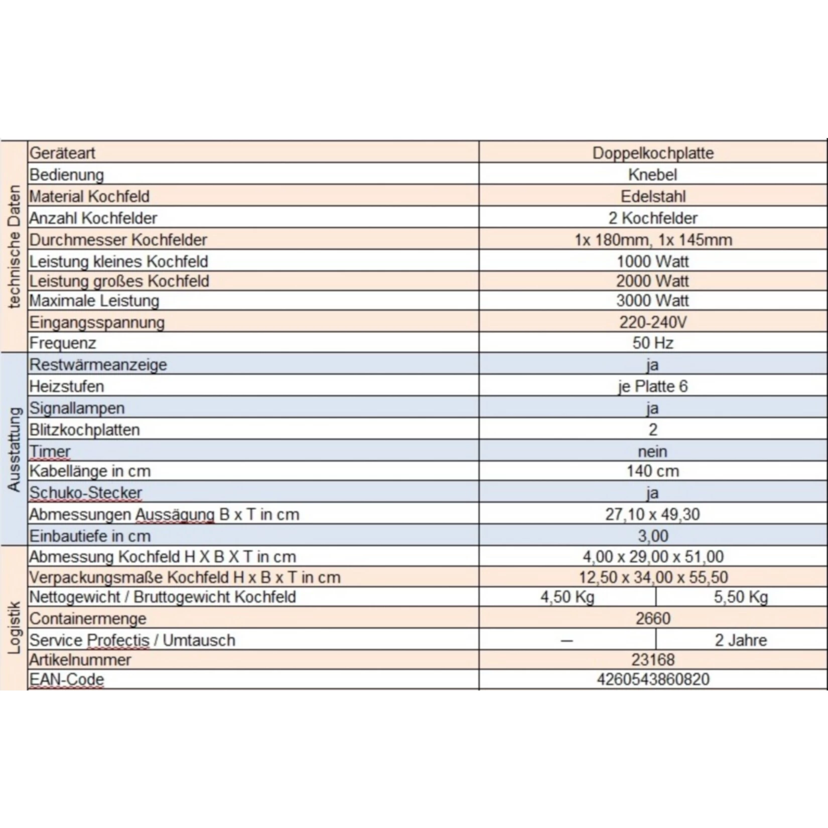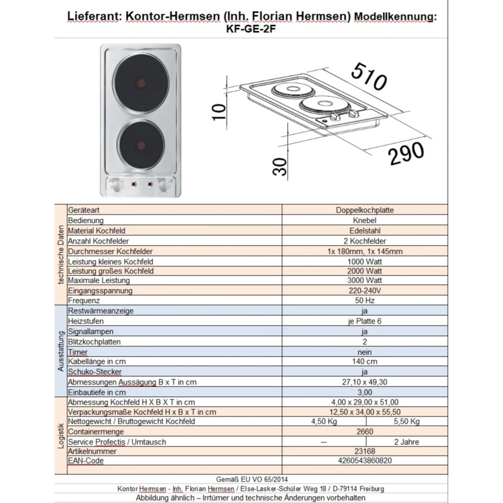 Durchmesser Kochfelder: 1x 180mm, 1x 145mm