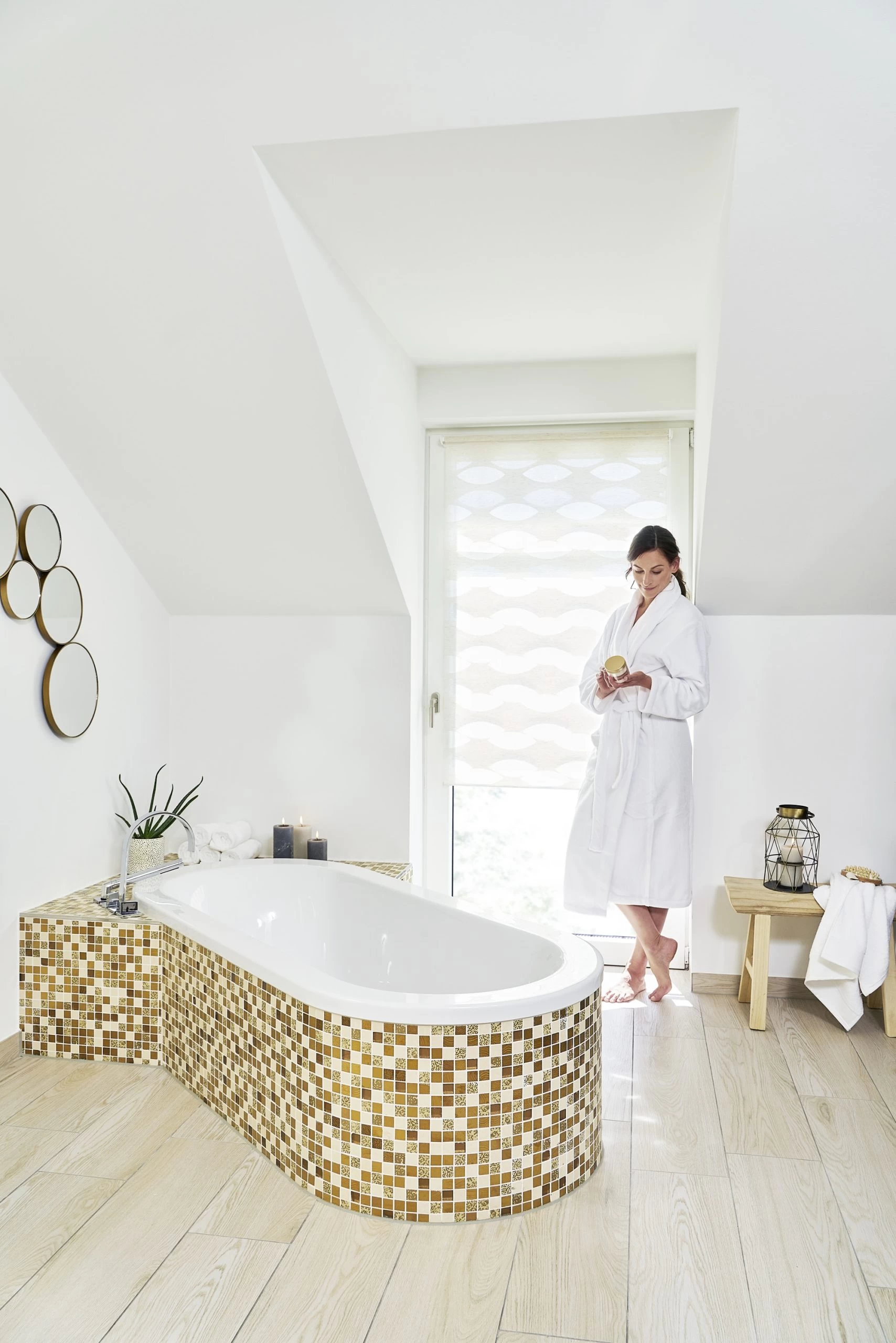 Mit Hilfe des seitlichen Kettenzugs kann die Position der Stoffbahnen punktgenau eingestellt werden, sodass entweder mehr Tageslicht durch die transparenten Ellipsen dringt oder die blickdichten Ellipsen zuverlässig vor neugierigen Blicken schützen. Diese Funktion kann in jeder beliebigen Höhe genutzt werden, da sich der Stoff wie bei einem herkömmlichen Seitenzugrollo komplett auf- und abrollen lässt.