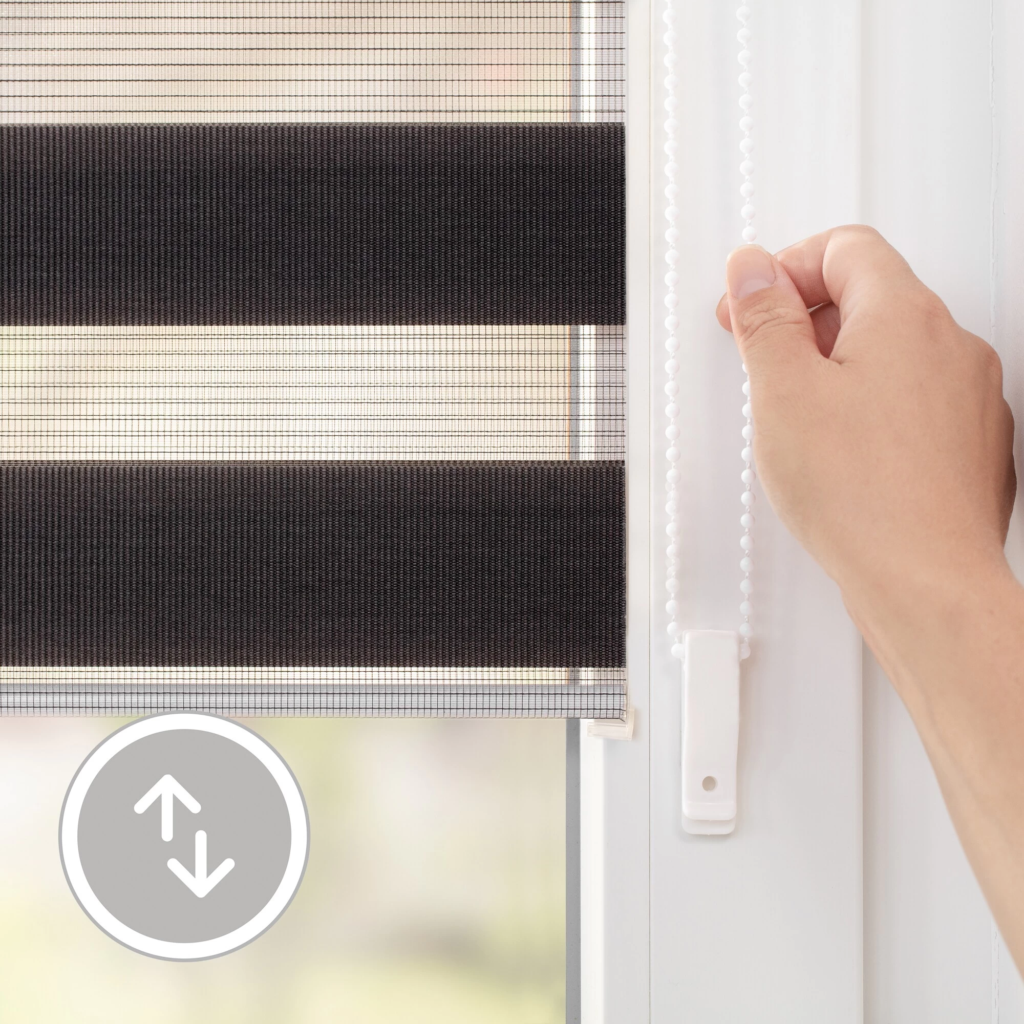 Mit Hilfe des seitlichen Kettenzugs kann die Position der Stoffbahnen punktgenau eingestellt werden, sodass entweder mehr Tageslicht durch die transparenten Streifen dringt oder die blickdichten Streifen zuverlässig vor neugierigen Blicken schützen. Diese Funktion kann in jeder beliebigen Höhe genutzt werden, da sich der Stoff wie bei einem herkömmlichen Seitenzugrollo komplett auf- und abrollen lässt.