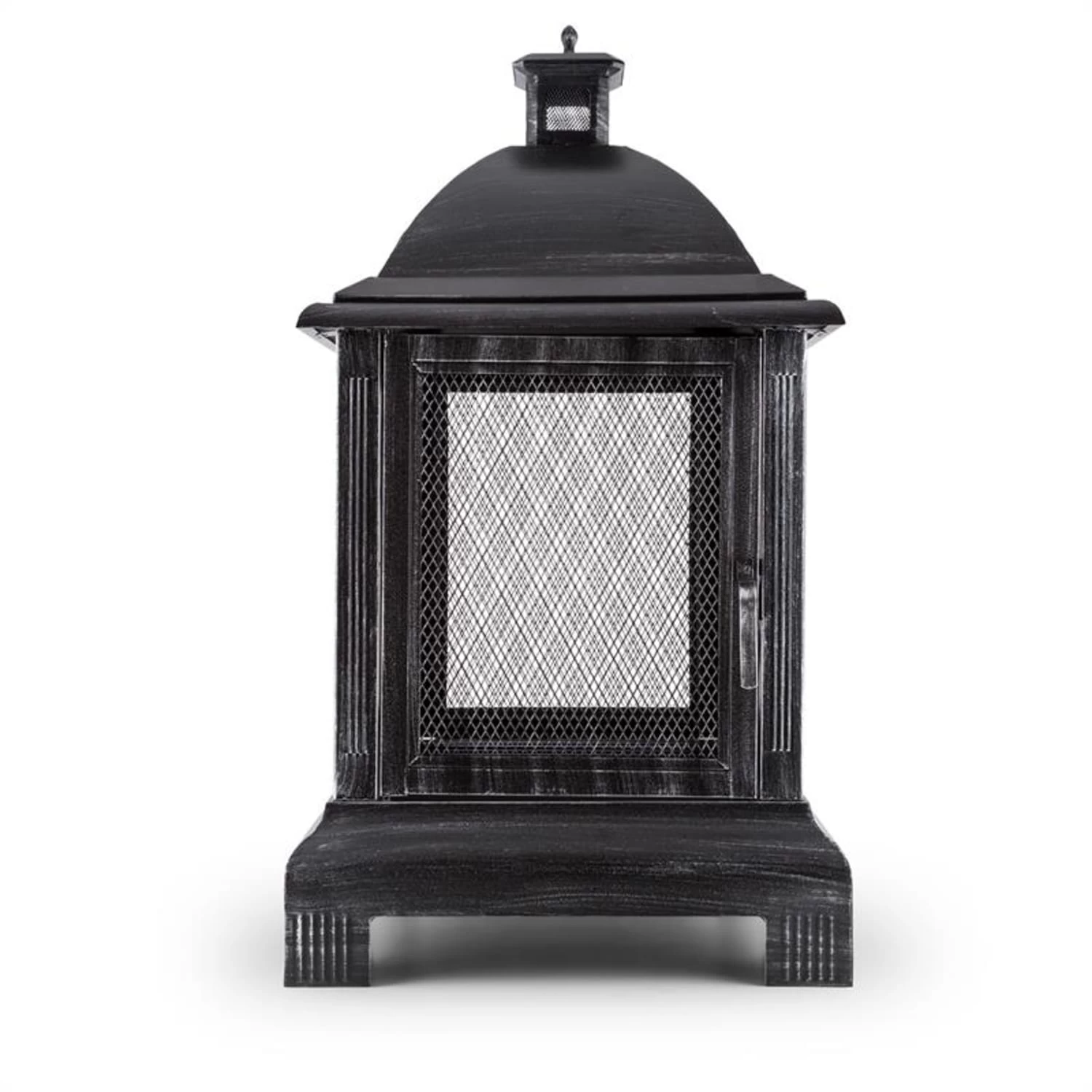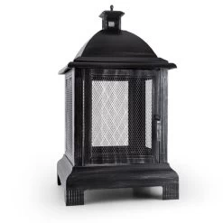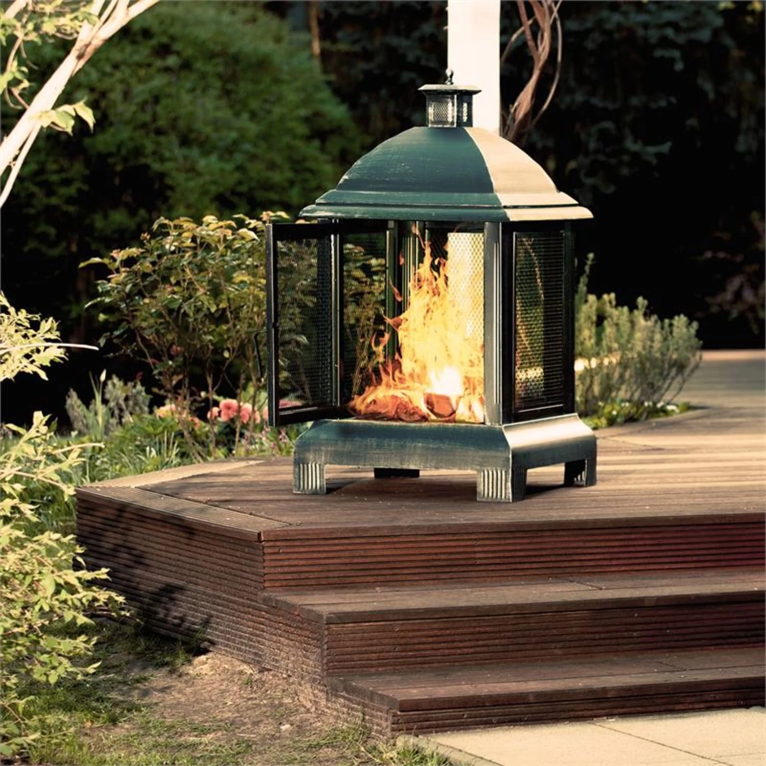 Dekorativer Gartenkamin mit 35 x 40 cm Feuerstelle im antiken Laternen-Design aus brüniertem Stahl.