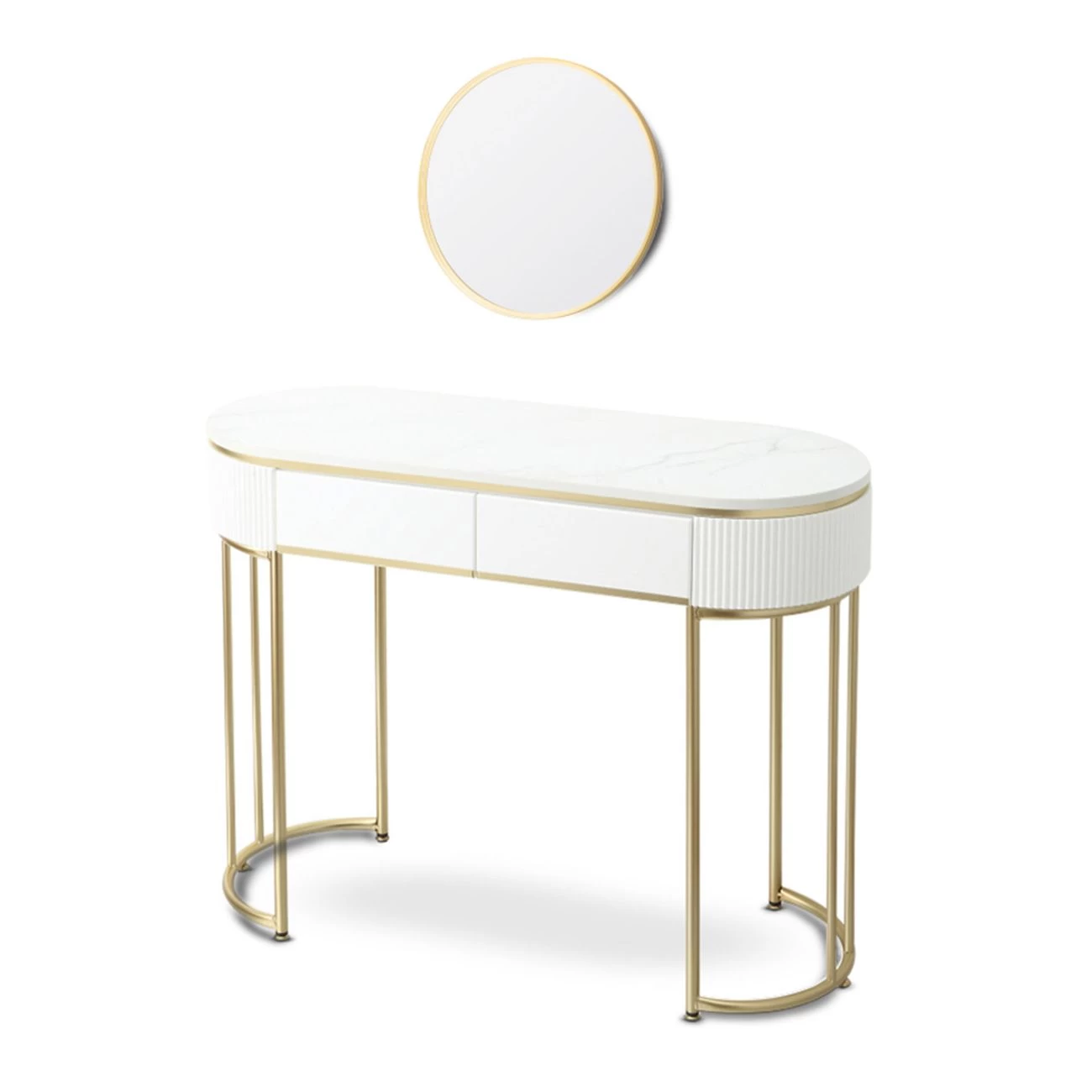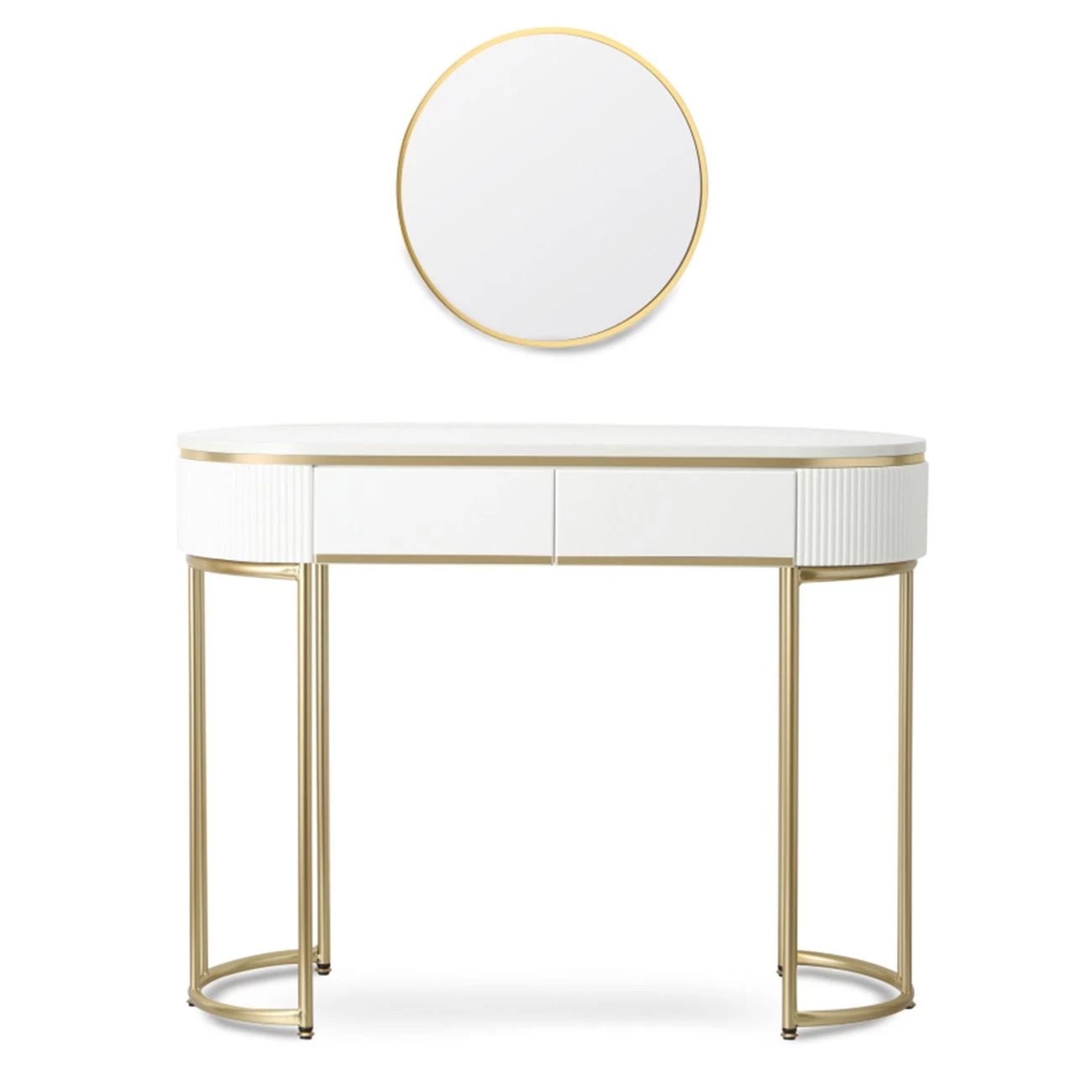 Die Schmink- und Frisierkommode bietet in zwei geräumigen Schubladen viel Platz für Make-up, Schmuck und Stylinghelfer wie Bürsten oder Pinsel. Durch sein elegantes, modernes Design mit Akzenten in Gold wirkt er sehr edel und fügt sich in verschiedene Interieurs gut ein. Ein edler runder Spiegel ergänzt die hochwertige Schminkkommode. Alle Utensilien, die Sie zum Auftragen von Make-up benötigen, haben Sie dank der großzügigen Ablagefläche und dem zusätzlichen Stauraum in den Schubladen immer schnell griffbereit.