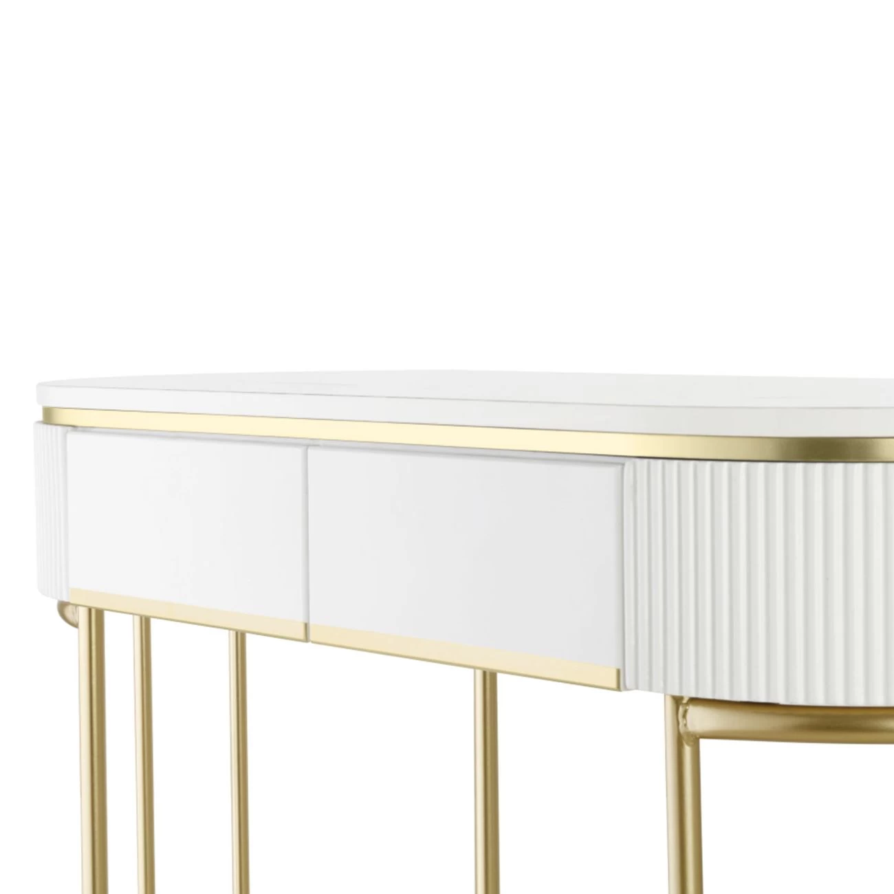 Sie erhalten ein perfekt aufeinander abgestimmtes Möbel-Ensemble. Der formschöne Kosmetiktisch besteht aus hochwertigem Holz. Attraktive Längsrillen zieren den an beiden Seiten elegant abgerundeten Korpus. Einen attraktiven Kontrast zu der pflegeleichten hellen Oberfläche bildet das glänzende goldfarbene Gestell. Die edle goldene Verzierung findet sich auch am Rand des Spiegels wieder. Dadurch entsteht ein sehr harmonisches Gesamtbild.