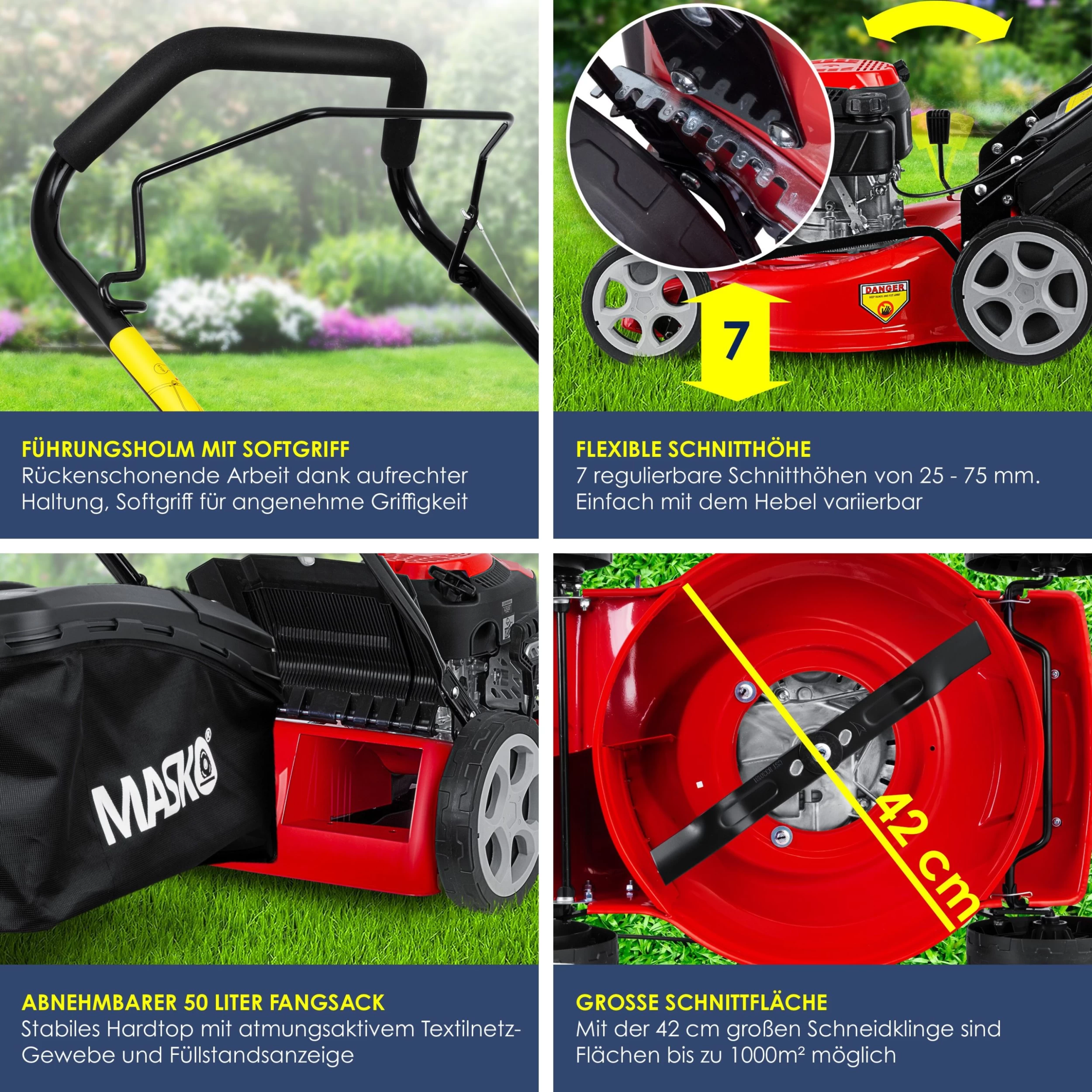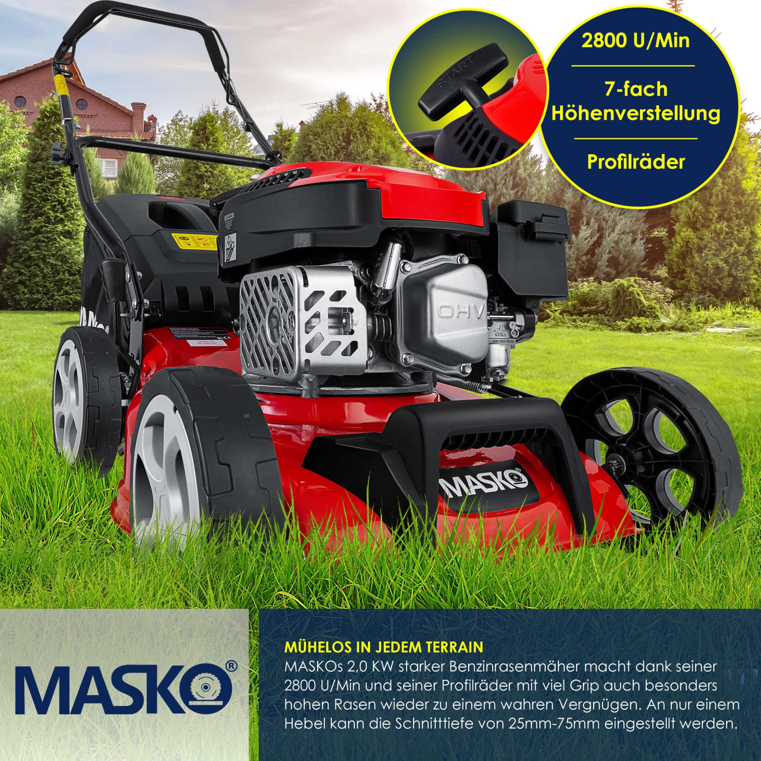 3-in1 Funktion – Mähen, Fangen, Äste und Laub heckseln. Unser Rasenmäher der Marke MASKO ist aus keinem Garten mehr wegzudenken. In seiner Vielseitigkeit zeigt sich der Benzin–Rasenmäher als unersetzliche Hilfe bei der optimalen Rasenpflege. Mit den gepolsterten Handgriffen lassen sich auch größere Grundstücke problemlos bearbeiten. Auch die Schnitthöhe ist dank der 7–stufigen Verstellbarkeit je nach Wunsch einstellbar. Der Motor lässt sich ganz einfach über einen Seilzug und den Kaltstart–Knopf starten.