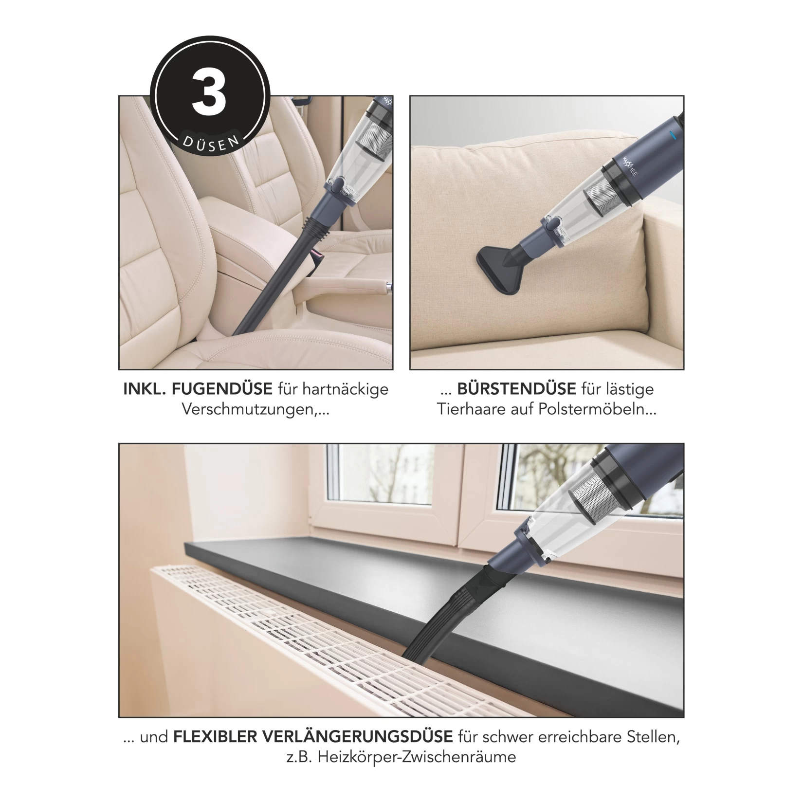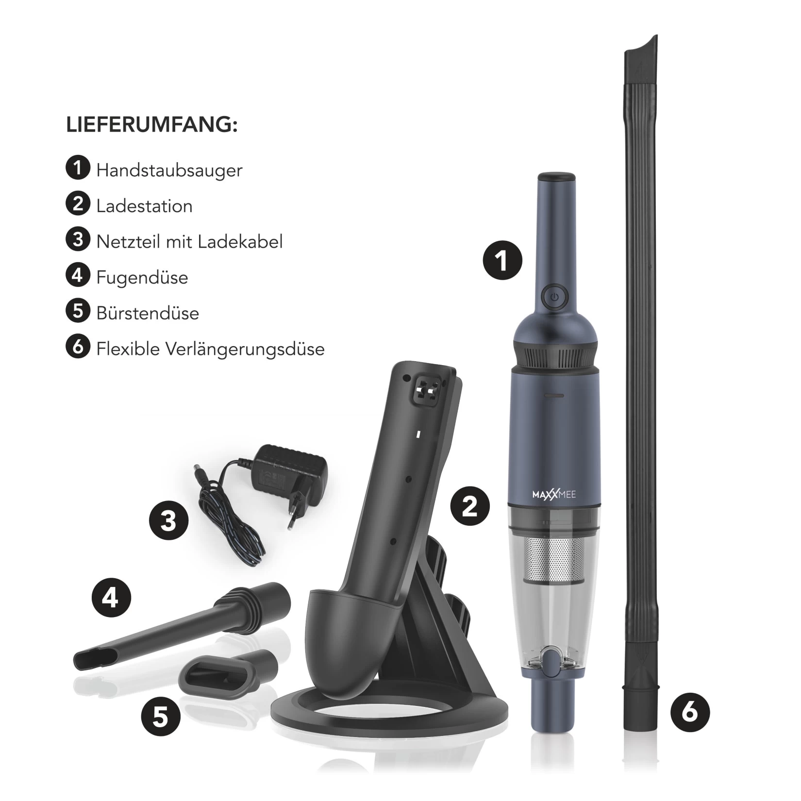 Das ist das handliche Kraftpaket für deinen Haushalt. Der „MAXXMEE“ Handstaubsauger ist mit BLDC-Motor und kraftvoller Saugleistung von bis zu 11 kPa ausgestattet – so werden schwer erreichbare Stellen, Polstermöbel und kleine Zwischenräume ideal von Staub und Schmutz befreit. Die drei verschiedenen Düsen unterstützen in nahezu jeder Situation: Die Fugendüse befreit schwer erreichbare Ecken zuverlässig von Staub und Schmutz. Die Bürstendüse saugt lästige Tierhaare, Krümel und Co. problemlos von Polstermöbeln und die Verlängerungsdüse sorgt für staubfreie Heizungen und flexibles Arbeiten bis an die Decke. Das leichte Gewicht von nur ca. 520 g sorgt für ein müheloses Handling. Der „MAXXMEE“ Handstaubsauger ist beutellos, kabellos und mit integriertem HEPA-Filter der optimale Begleiter für eine staub- und pollenfreie Raumluft.