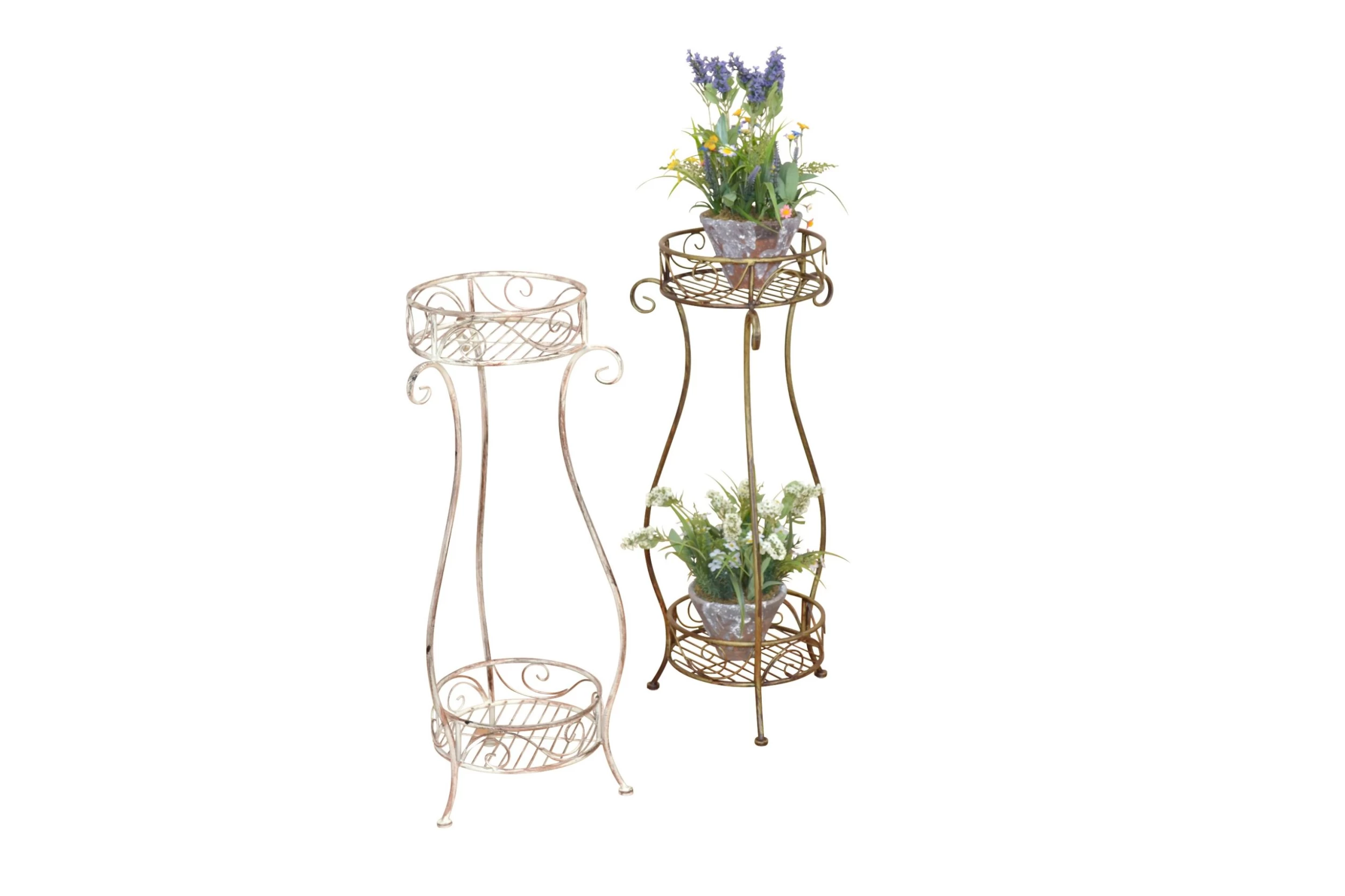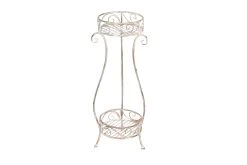 Stabiler, standfester Blumenständer aus Metall mit einer trendigen Oberfläche im Vintage-Look, in zwei Farben lieferbar.. Die Oberfläche ist zusätzlich von Hand gewischt und mit gewollten Gebrauchsspuren gearbeitet. Aufgrund der Handarbeit können Abweichungen in Form und Farbe auftreten. Die runden Gitter-Abstellböden haben einen Durchmesser unten von ca. 20 cm und oben ca. 22,5 cm und einen schön verzierten Rand, der ca. 7 cm hoch ist. Artikel wird montiert geliefert, kein unnötiges, langes zusammenmontieren erforderlich. Maße ca. cm: Durchmesser 30 cm x Höhe ca. 77 cm. Stellhöhe zwischen den Böden ca. 53 cm.
