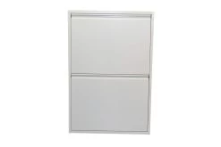 Mülltrenner mit 2 Klappen, dahinter je zwei herausnehmbare Kunststoffeimer. Korpus und Fronten aus Metall, uni weiß, beschichtet. Die zwei Klappen lassen sich auf einmal öffnen. Wandmontage erforderlich. Artikel wird montiert angeliefert. Maße ca. cm: (B/H/T) 62/93/25. Je Eimer 27/35/21,5 cm.