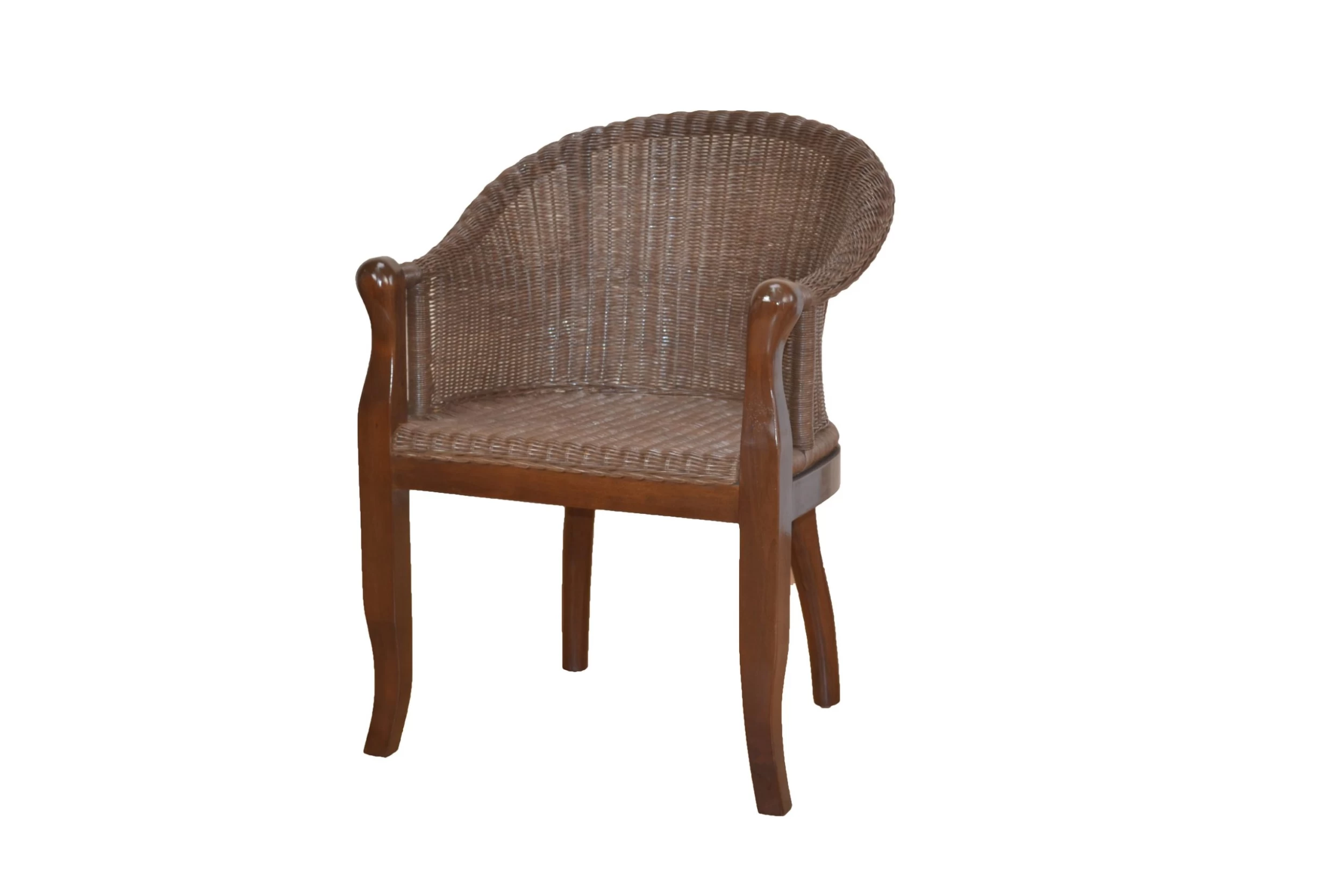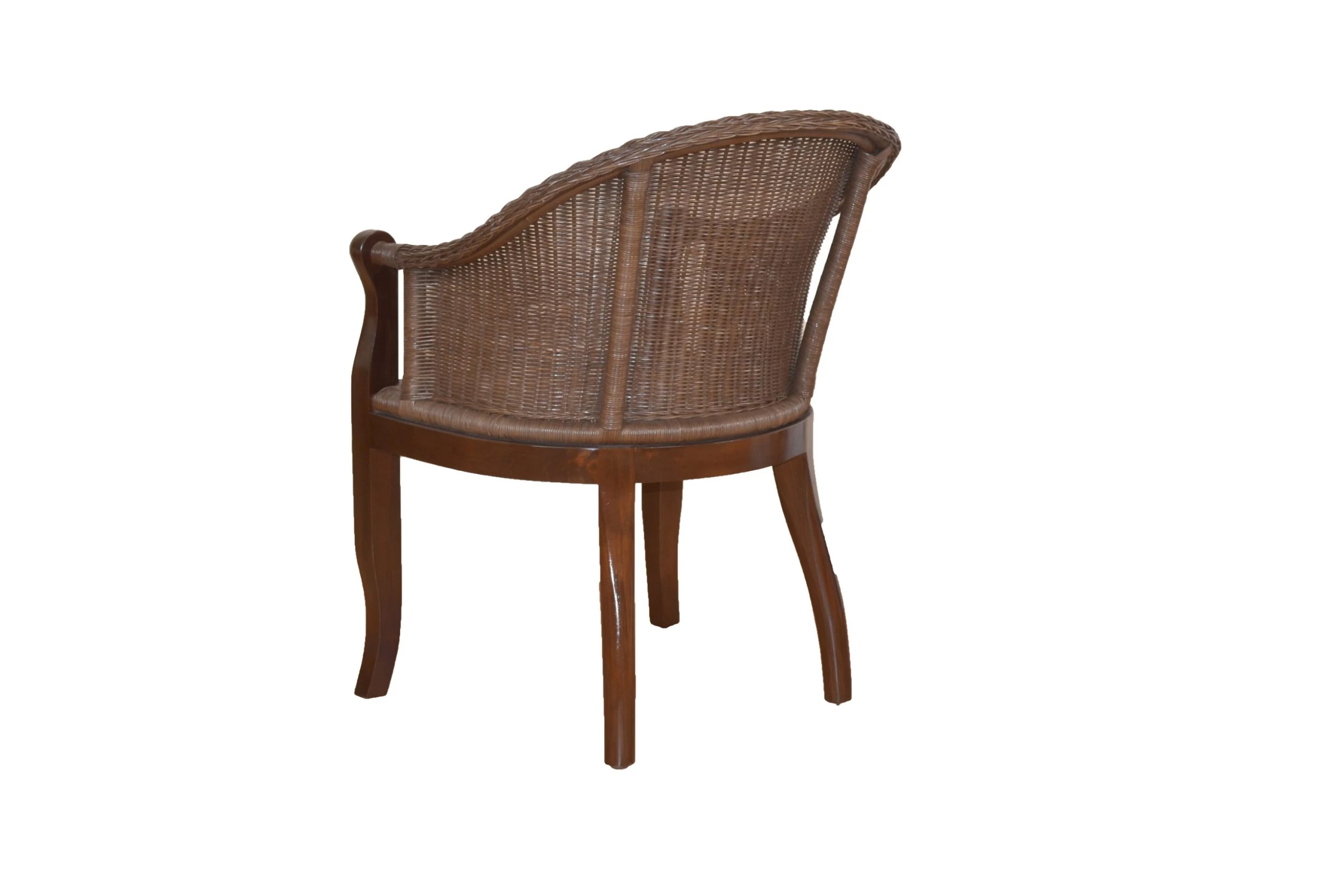 Moderner Rattansessel, Gestell aus Massivholz Pinie, braun gebeizt und lackiert. Sitzschale mit Rattanrohr, handgeflochten, braun gebeizt und lackiert. Ohne Kissen, Dekoration.