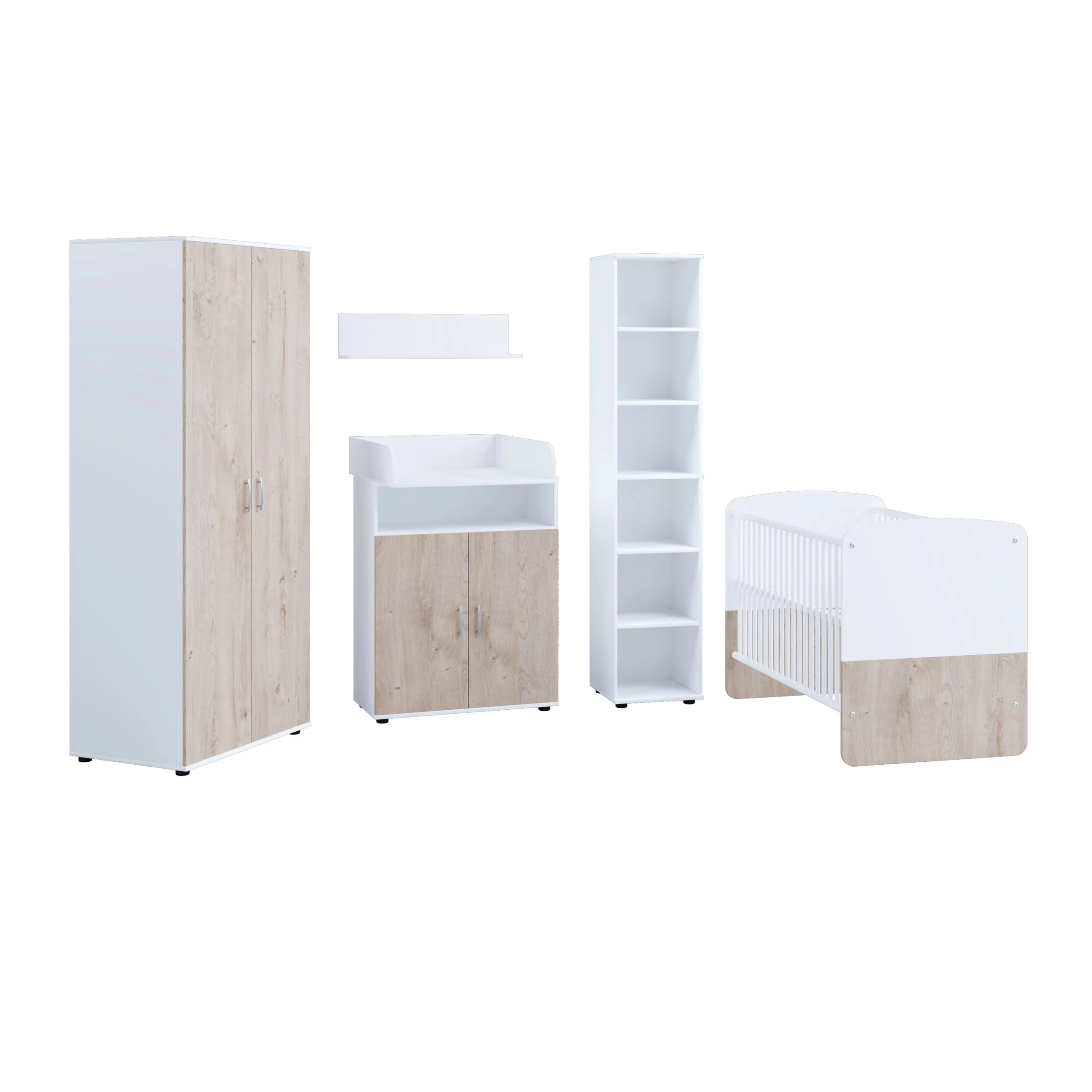 Babyzimmer Hanna Set 5 best. aus Babybett, Kommode, Wickelaufsatz, Wandboard, Regal mit 6 Fächern und Kleiderschrank 2-trg. Nachfolgend die Beschreibung der Einzeltypen des Sets.