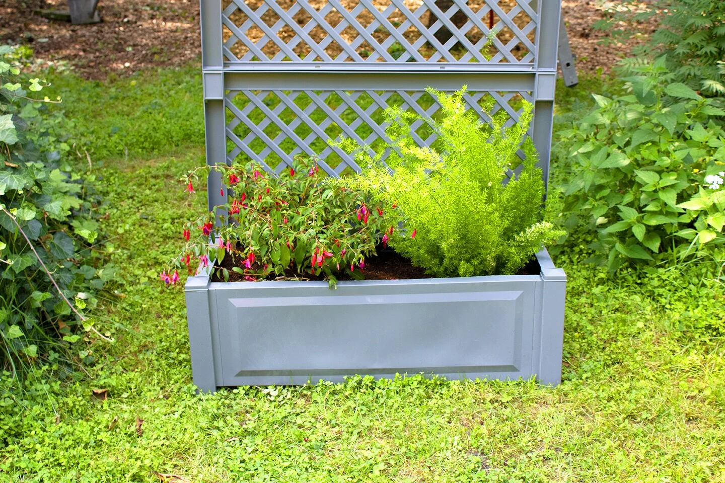Mit farbenfrohen Kletterpflanzen bepflanzt, setzt dieser Pflanzkasten mit Rankgitter Ihre Terrasse in Szene und schafft einen dekorativen Sicht- und Windschutz! Aufgrund seiner leichten Montage und der Vielfalt dieser Serie ist einer Kombination mit anderen Teilen keine Grenzen gesetzt. Hergestellt aus schlagfesten, UV-beständigem Vollkunststoff. Lieferbar in den Farben weiss, grün und anthrazit.
