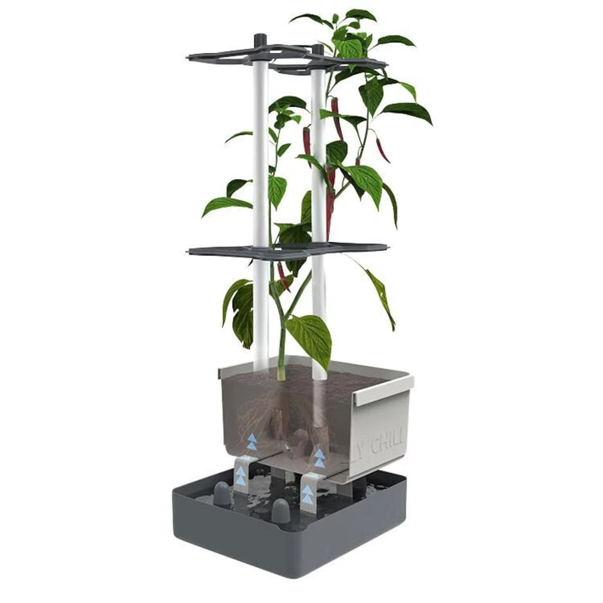 - Bewässerungsbänder verbinden Wassertank und Pflanztopf