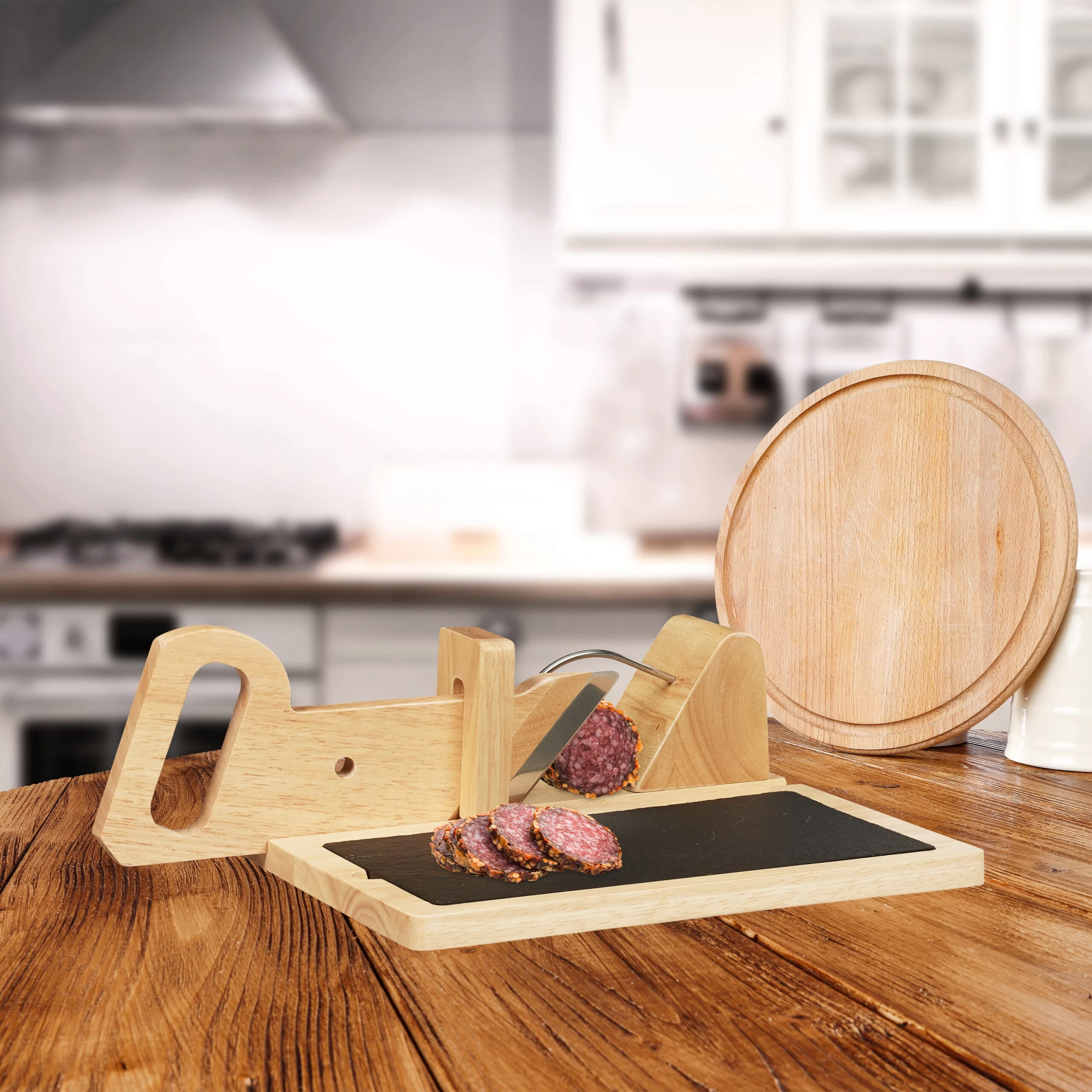 Mit einer kalten Platte macht man auf keiner Party etwas verkehrt. Doch das Schneiden von Wurst und Käse kann mitunter sehr aufwendig werden. Mit der rustikalen Wurstschneidemaschine können Ihre Gäste den Aufschnitt ganz einfach frisch selbst machen. Egal ob Salami, Schinken, Speck oder Käse – die Guillotine schneidet alles in schöne gleichmäßige Scheiben. Die Bedienung ist dabei ganz einfach: Sicherheitsstift herausziehen, Messerschlitten nach hinten schieben, Wurst einlegen und schneiden.