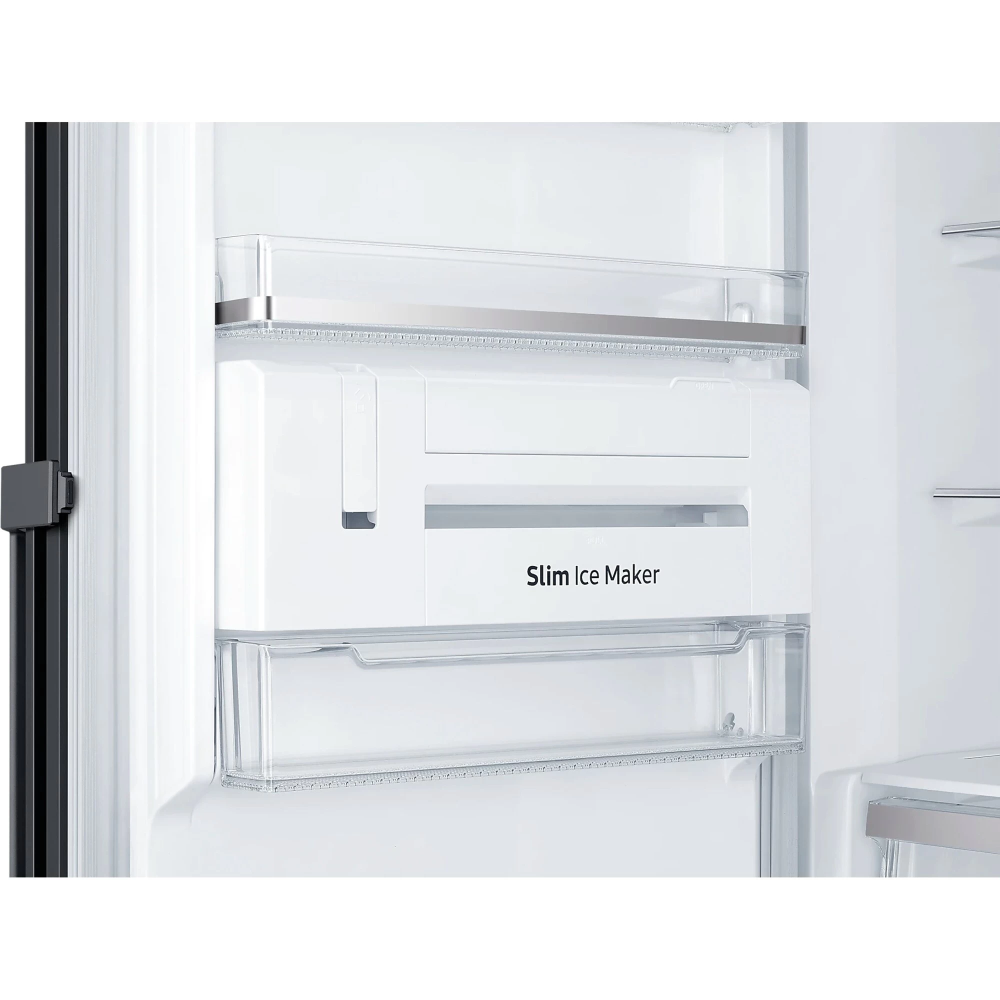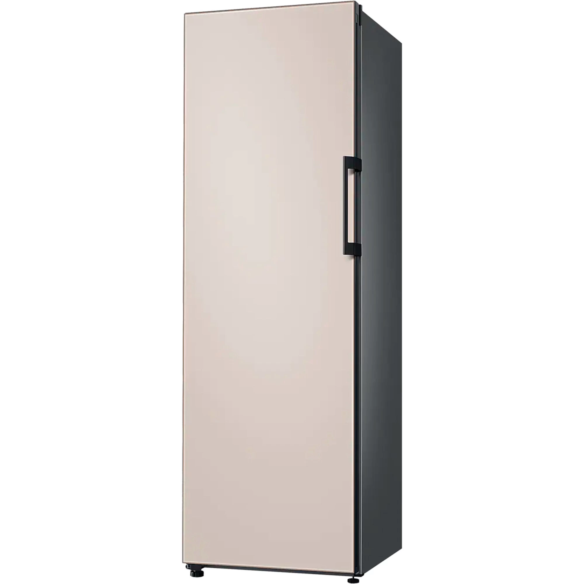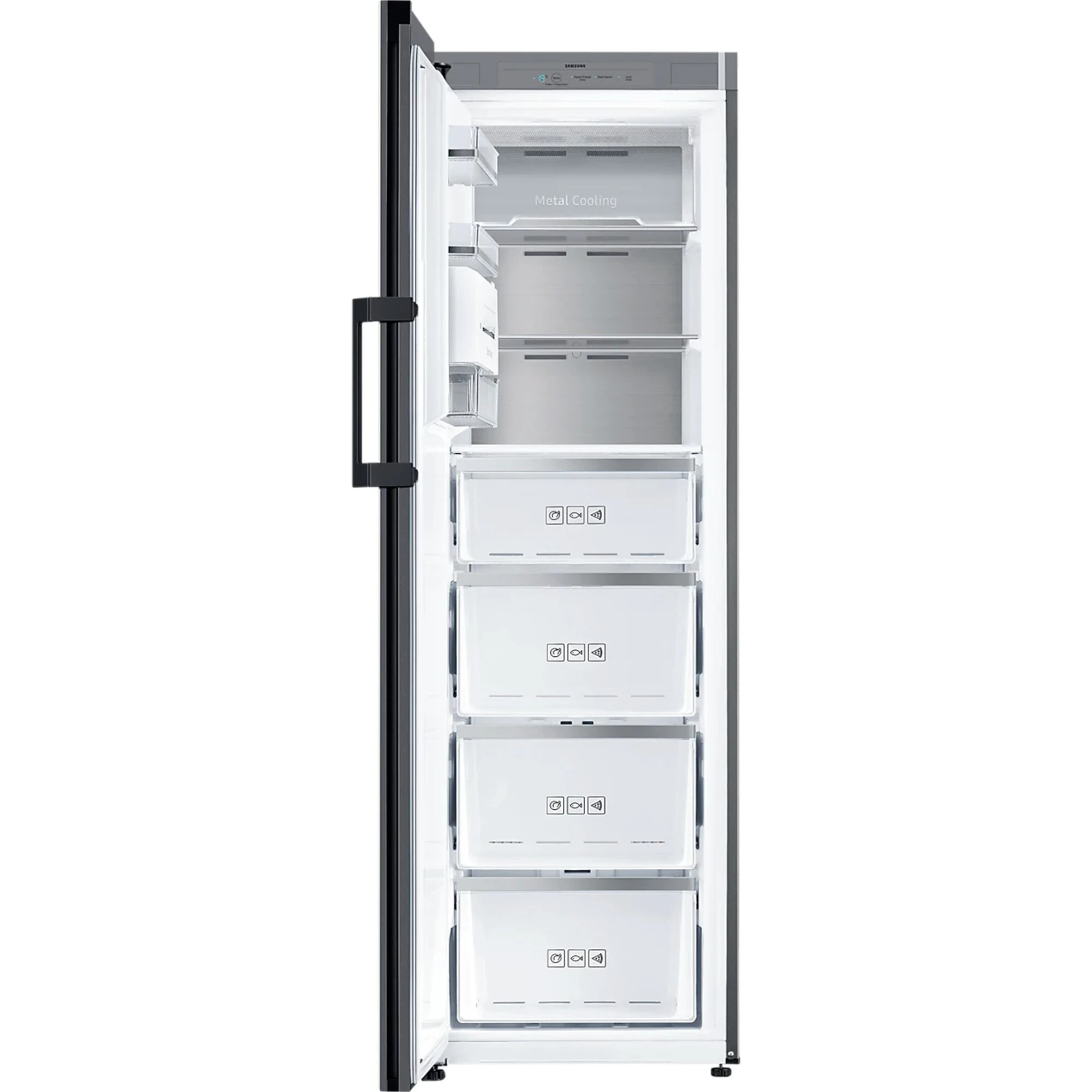 Der Gefrierschrank Bespoke RZ32A748548/EG von SAMSUNG bietet einen Gesamtnutzinhalt von 323 Litern und besticht durch sein stilvoll-minimalistisches und modulares Design. Er stellt drei Abstellflächen, drei Gefrierschubladen sowie zwei Türfächer für die übersichtliche Lagerung von Gefriergut zur Verfügung. Der Slim Ice Maker hält stets eine Portion Eiswüfel für gekühlte Getränke parat. No Frost+ leitet die entstehende Feuchtigkeit nach außen und verhindert damit Eisbildung. Somit spart man gleich doppelt Energie: keine Eisschichten im Eisfach und kein Hochkühlen nach dem Abtauen. Die gleichbleibende Kühlung auf jeder Ebene des RZ32A748548/EG wird unterstützt durch All-Around Cooling – ein ausgeklügeltes System zur Belüftung, welches die Temperatur im gesamten Innenraum auf ein gleichmäßiges Niveau herunterregelt. Die elegante Metall-Innenrückwand sorgt für eine gleichmäßige Innentemperatur, zudem wird die gewünschte Temperatur durch die in der Metallplatte gespeicherte Kälte nach dem Öffnen und Schließen der Tür schnell wieder erreicht. Die Temperaturregelung und Funktionssteuerung erfolgt über das Innenliegende Display und dank Smart Conversion lässt sich der Gefrierschrank bei Bedarf per Knopfdruck in einen Kühlschrank umwandeln. Mit einem Stromverbrauch von 329 kWh im Jahr ist der RZ32A748548/EG in die Energieeffizienzklasse F eingestuft.