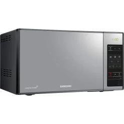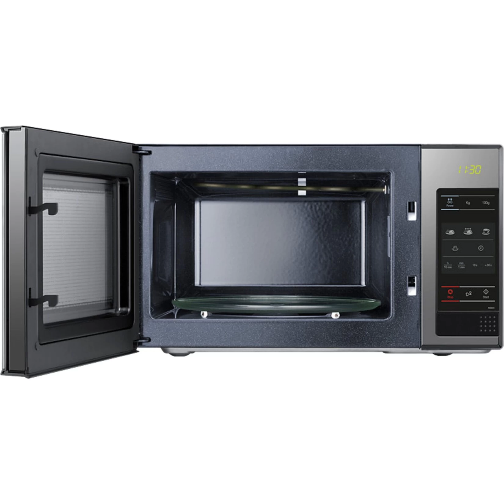 Die Samsung Mikrowelle ME83X überzeugt mit 23 Litern Nutzinhalt. Ihre Keramik-Innenbeschichtung sorgt für hohe Beständigkeit gegen Kratzer und verhindert, dass Gerüche und Geschmäcker aufgenommen und beim nächsten Kochvorgang übertragen werden. Außerdem haften Fett und Schmutz nicht an der glatten Oberfläche und lassen sich ohne zu schrubben mit einem feuchten Tuch abwischen. Die Uhrzeitanzeige der ME83X lässt sich im 12- oder 24-Stunden-System anzeigen. Für mehr Sicherheit sorgt die Kindersicherung.