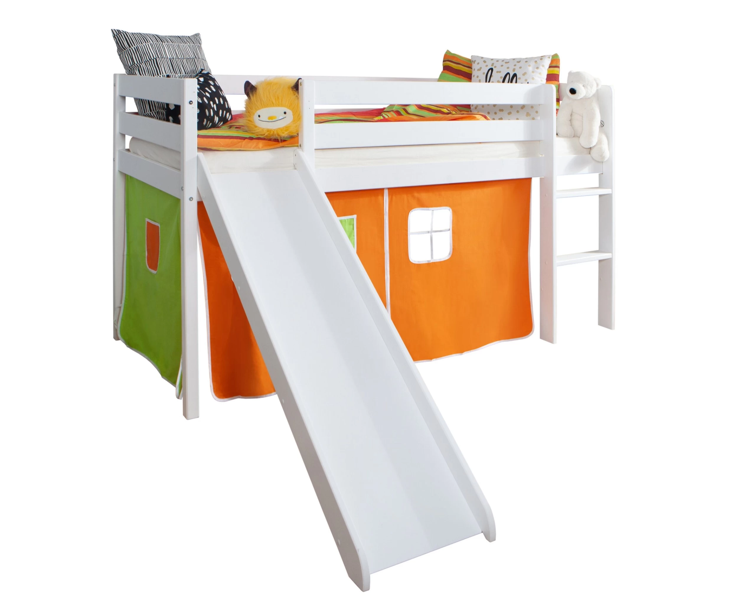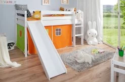 - Lieferumfang: Rutschbett inkl. Vorhangstoff „Orange-Grün“, Montagematerial und Montageanleitung (ohne Rollrost, Matratze und Deko)