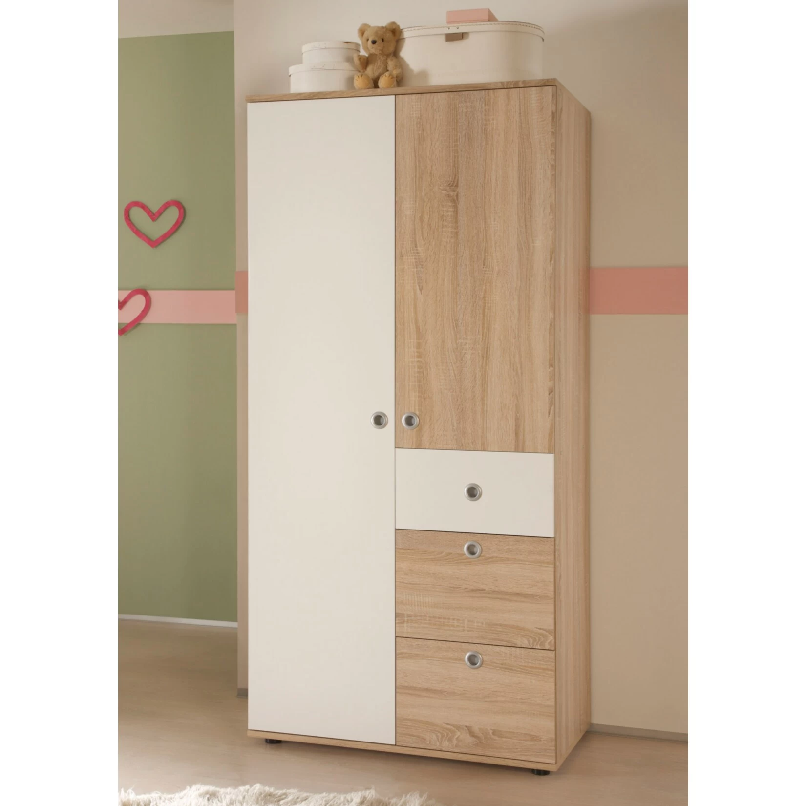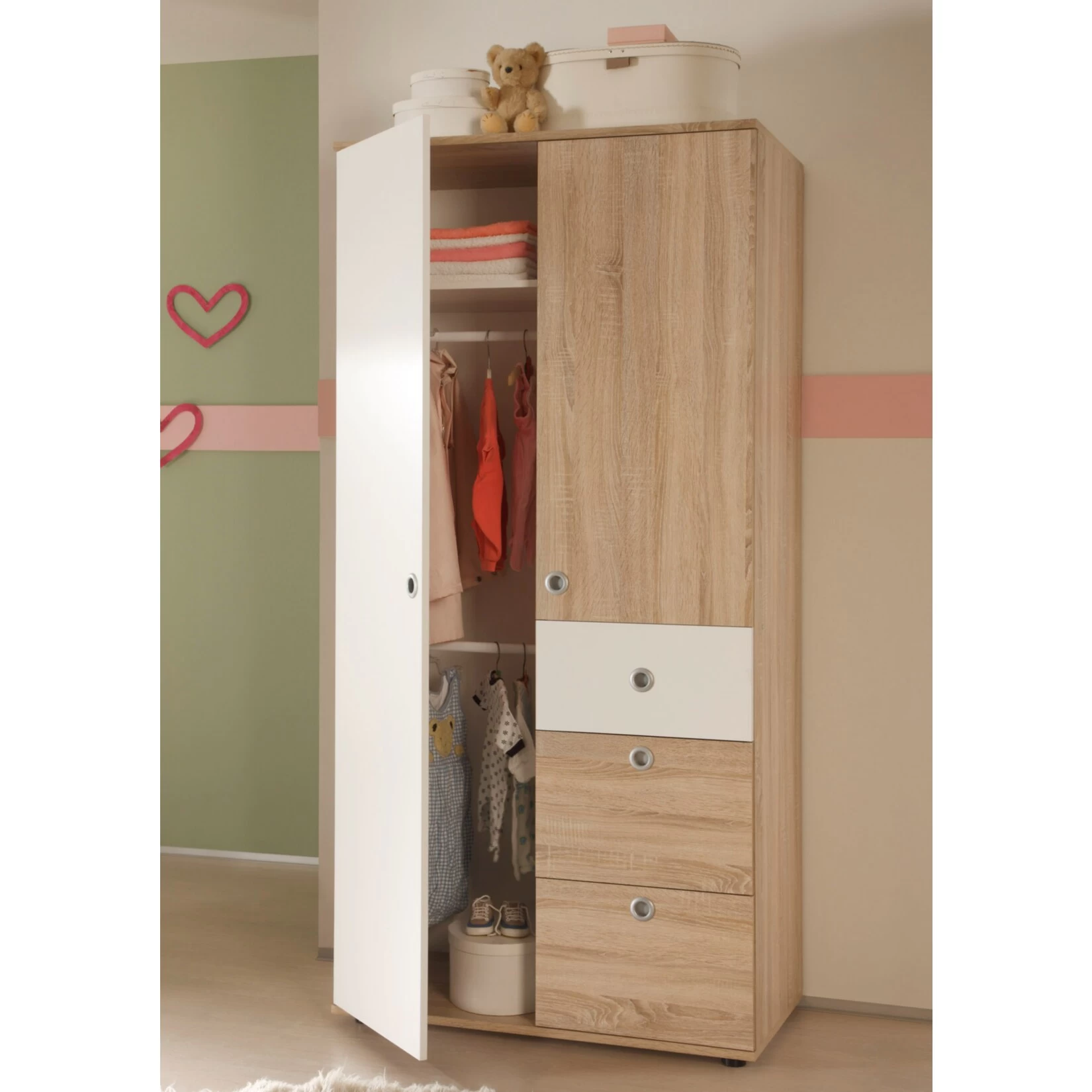 Grade im Baby- und Kinderzimmer ist eine freundliche und helle Optik Pflicht! Aber auch praktischer Nutzen ist sehr wichtig, grade wenn die Kinder größer werden. Dieser Schrank vereint beides!