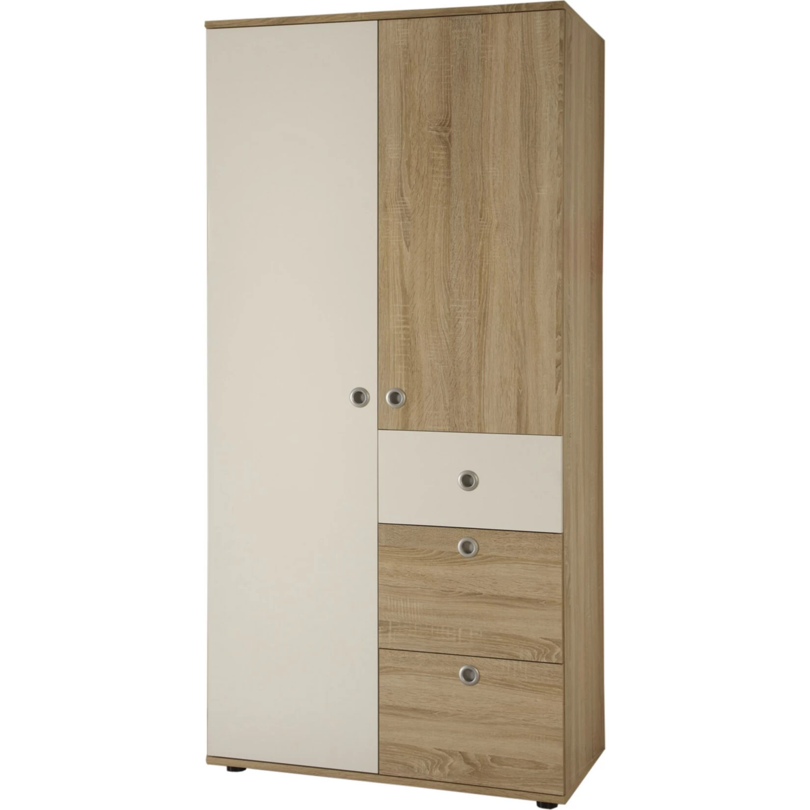 - Eigenschaften: 3x Schubkästen, 2x Türen, 2x Kleiderstangen, 2x Einlegeböden, Alu-Optik Griffe