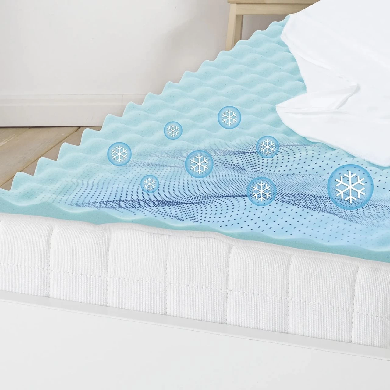 Temperaturausgleichend & komfortabel Mit dem super-komfortablen Matratzen-Topper kühlend können Sie sich wohlverdienten Schlaf gönnen und kommen selbst in heißen Sommernächten nicht ins Schwitzen. Dank weicher Füllung mit Memory-Schaum passt er sich optimal den Körperkonturen an und sorgt so für angenehme Entlastung in jeder Liegeposition. Die Cool-Touch-Oberfläche mit Mesh-Einsatz wirkt angenehm klimaausgleichend auch bei hohen Temperaturen.Waschbarer Außenbezug.Materialfüllung: Gel-Memory-Schaum (30g/m3). Obermaterial: Maschenware, Unterseite: Antirutsch-Material.
