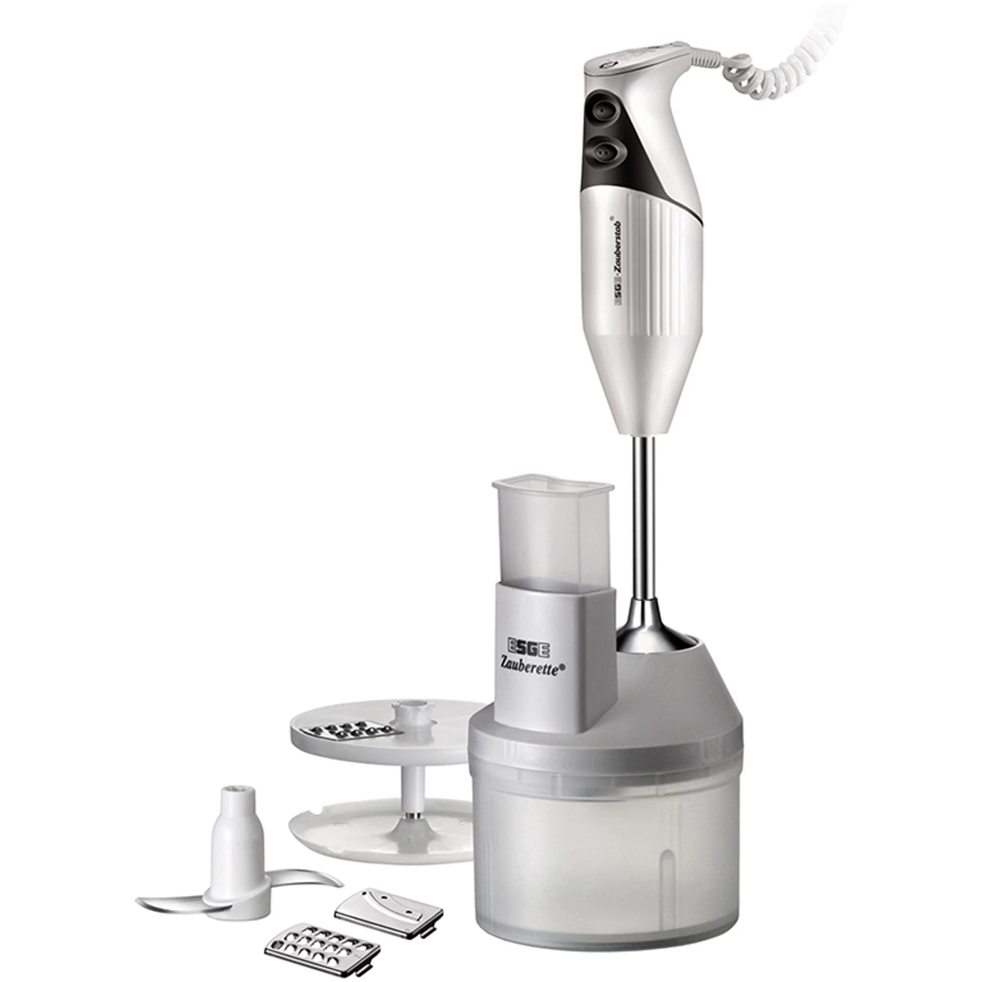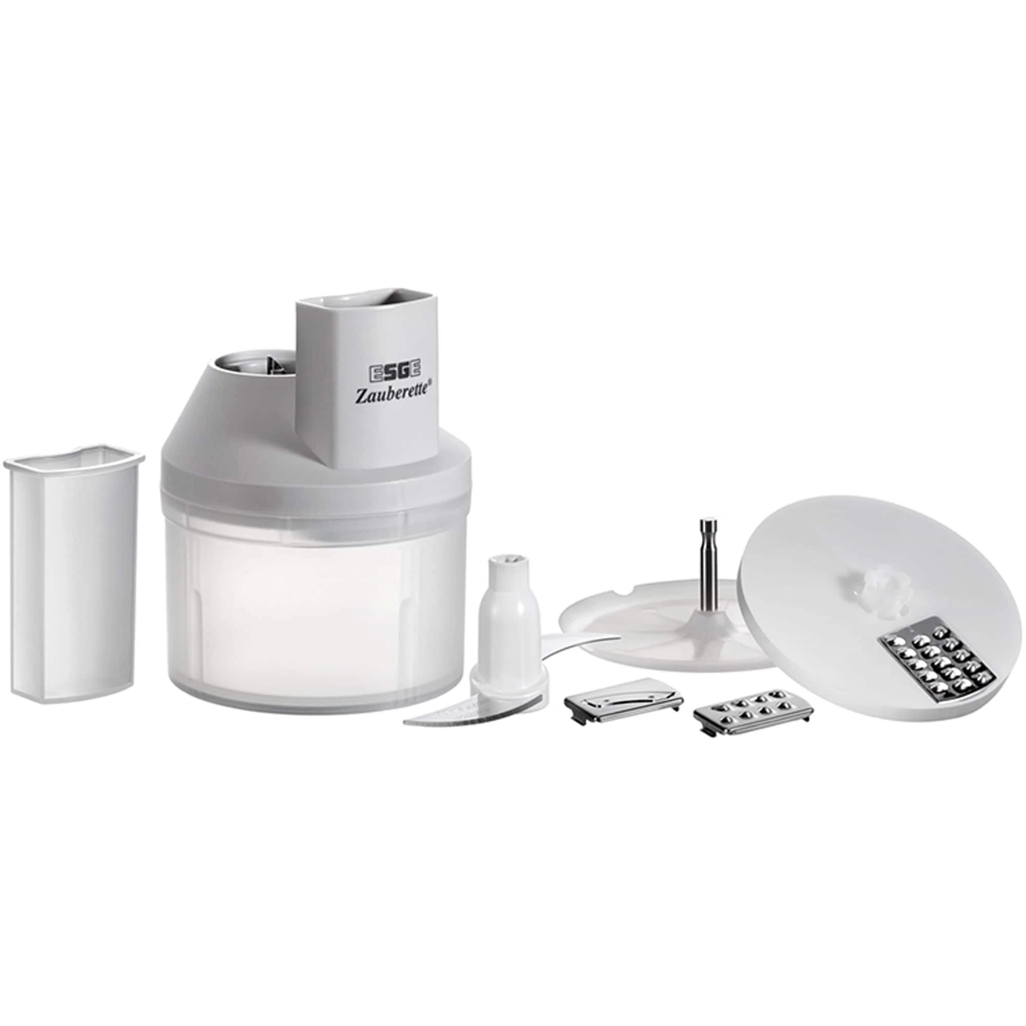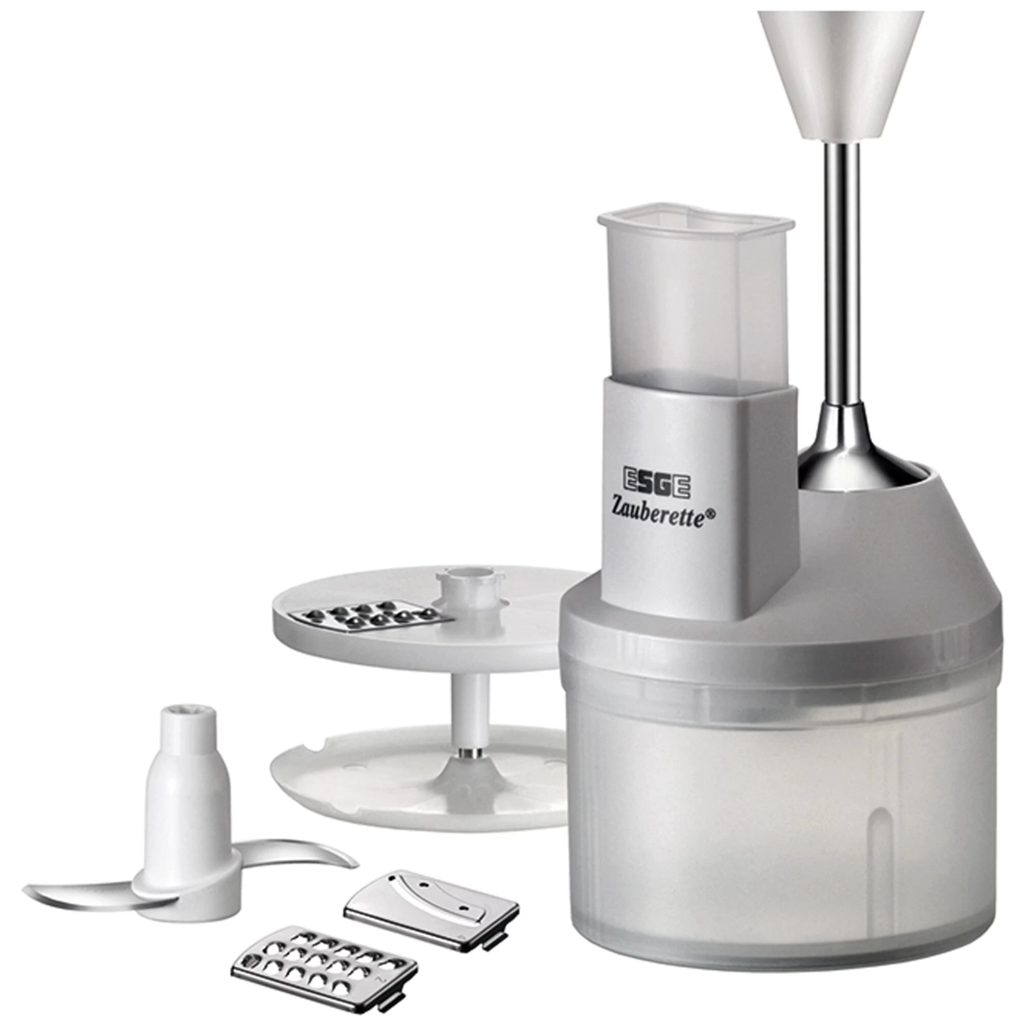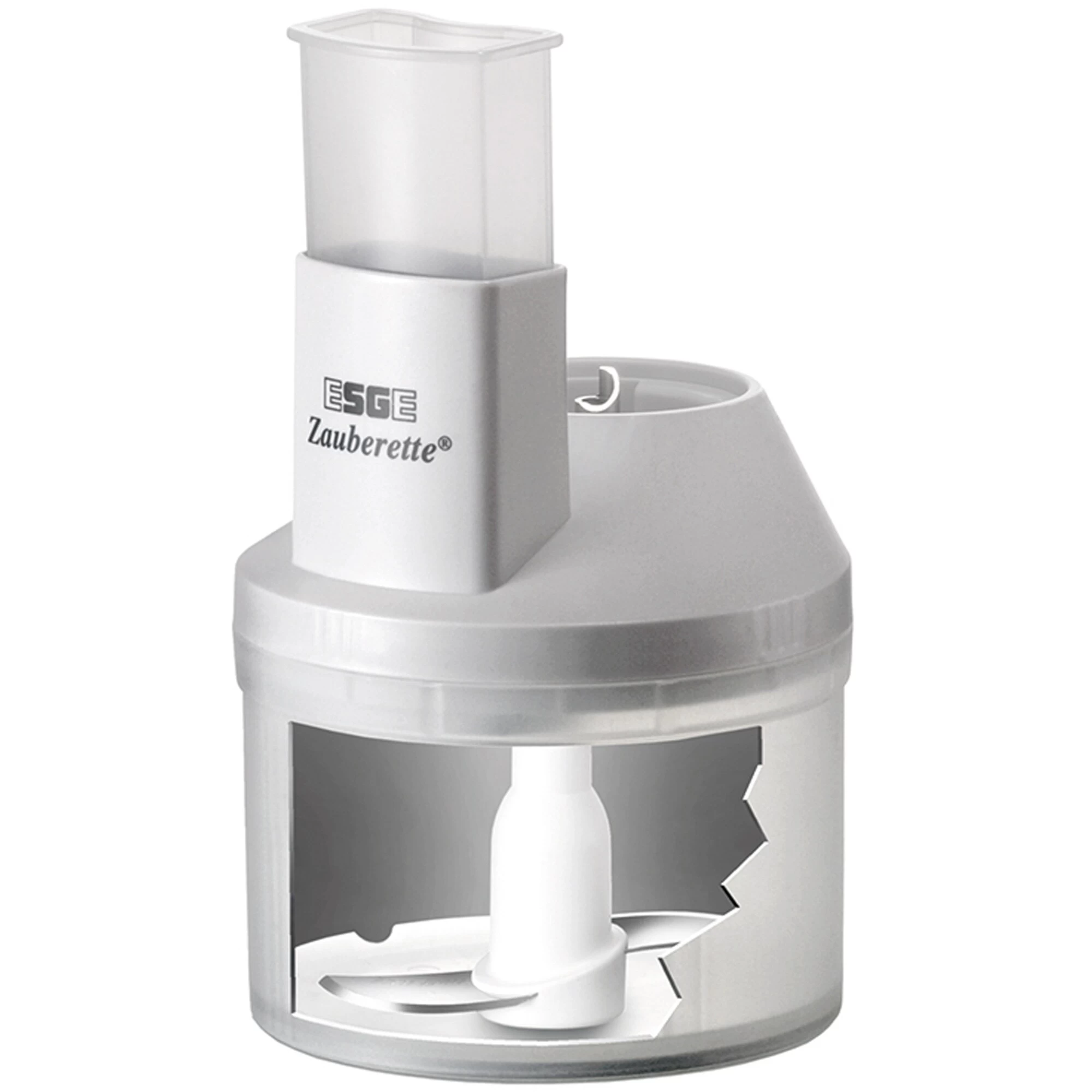 Der ESGE-Zauberstab (nicht im Lieferumfang enthalten) hat eine Partnerin: die ESGE-Zauberette. Und sie sind ein starkes Duo – in jeder Hinsicht. Zusammen mit der ESGE-Zauberette geht vieles, wovon ESGE-Zauberstab-Besitzer früher nur träumen konnten: einfach den ESGE-Zauberstab auf das kleine handliche Gehäuse der ESGE-Zauberette aufsetzen und durchstarten. Mit dem Hackmesser werden Fleisch und Fisch, Zwiebeln, Kräuter und auch Schokolade zerkleinert. Nüsse, Parmesan und Meerrettich werden mit den Raspelscheiben auf Wunsch puderfein gerieben. Und die Gurken fürs Tzaziki kommen auf den Punkt geraspelt aus der Zauberkiste. Ganze Scheiben gefällig? Die Schneidscheibe schafft auch das.