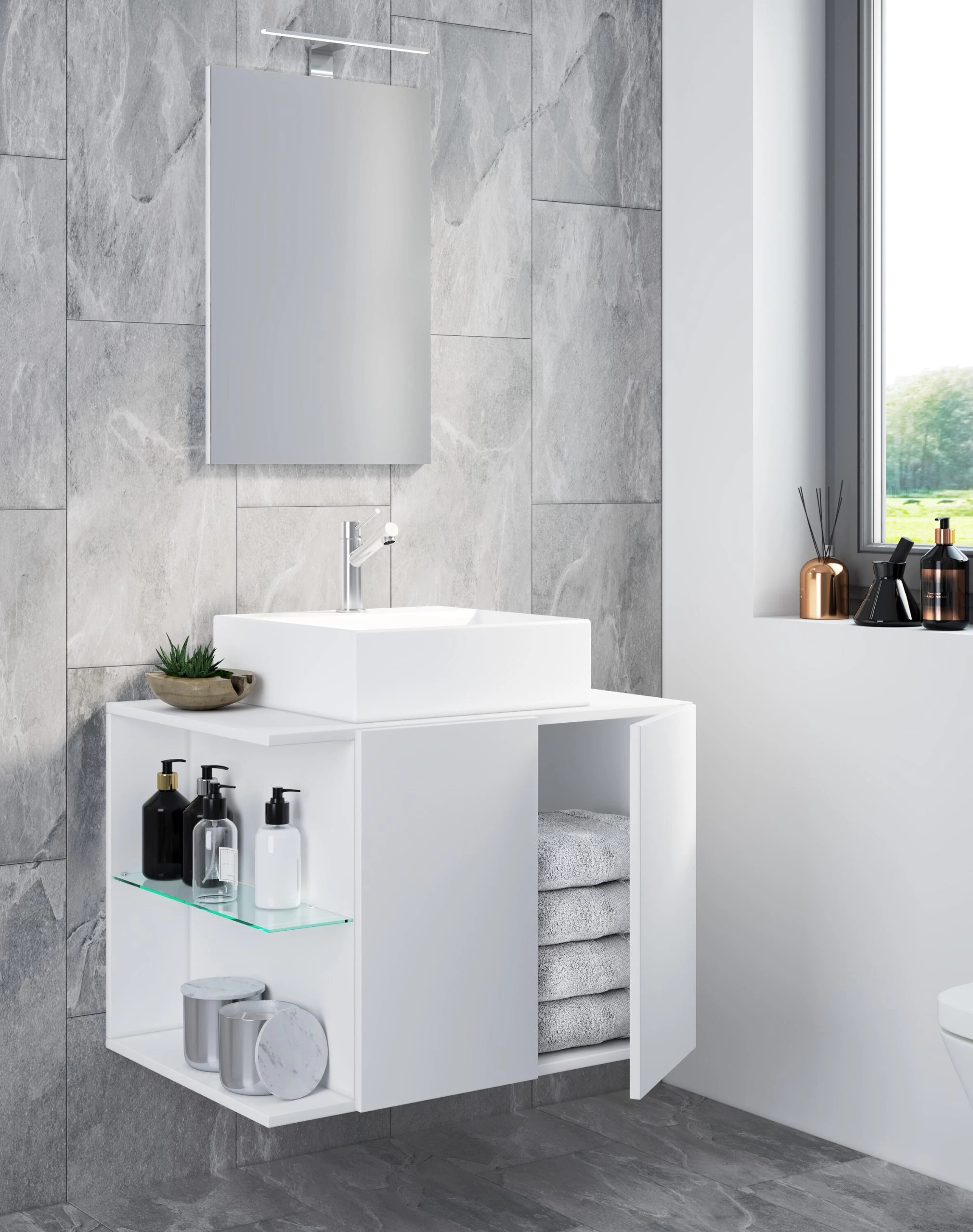 - Optionales Zubehör: Der Waschplatz kann mit weiteren Badmöbeln der Serie „Hausa“ und der Beleuchtung „VCM Blino“ ergänzt werden.