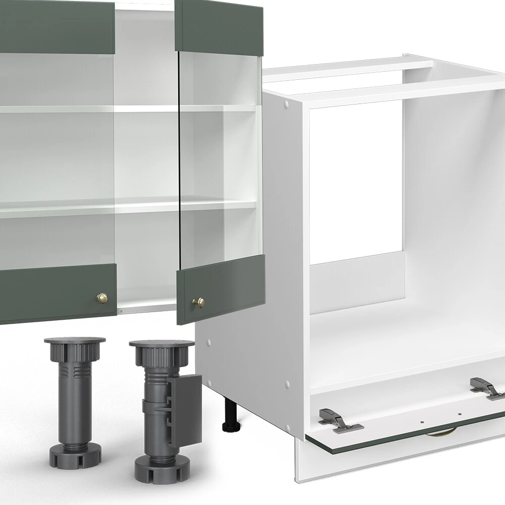 Die bequemen Softclose-Scharniere bieten ein bequemes Handling und die hochwertigen Metallauszüge der Schubladen sorgen für eine lange Lebensdauer der Küchenmöbel. Die Schränke sind mit höhenverstellbaren Stellfüßen ausgestattet, dank denen sich Bodenunebenheiten mühelos ausgleichen lassen.