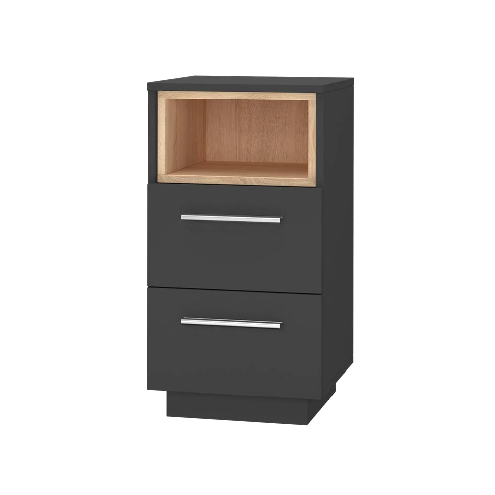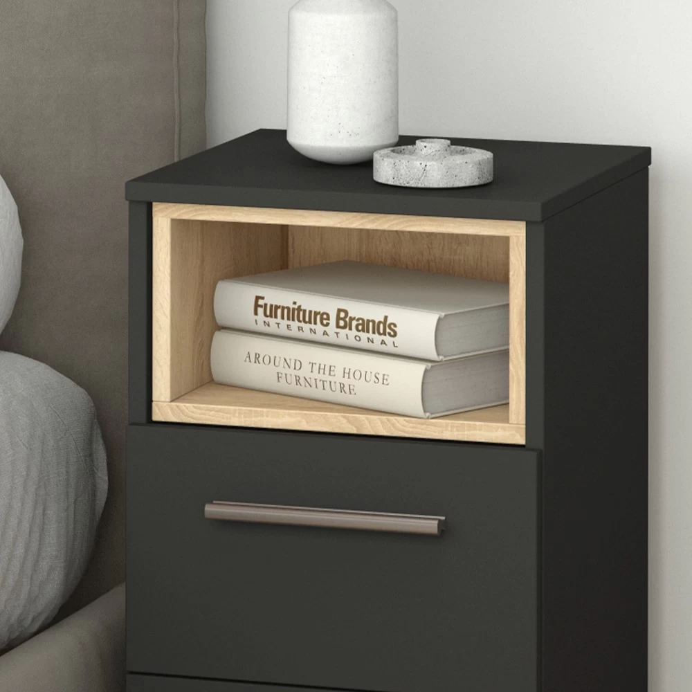 Unser Nachtschrank Beatrice bildet die perfekte Ergänzung für Ihr Schlafzimmer. Das modische Design, mit einem offenen Fach im Holz-Look, fügt sich ausgezeichnet in jede Einrichtung ein.