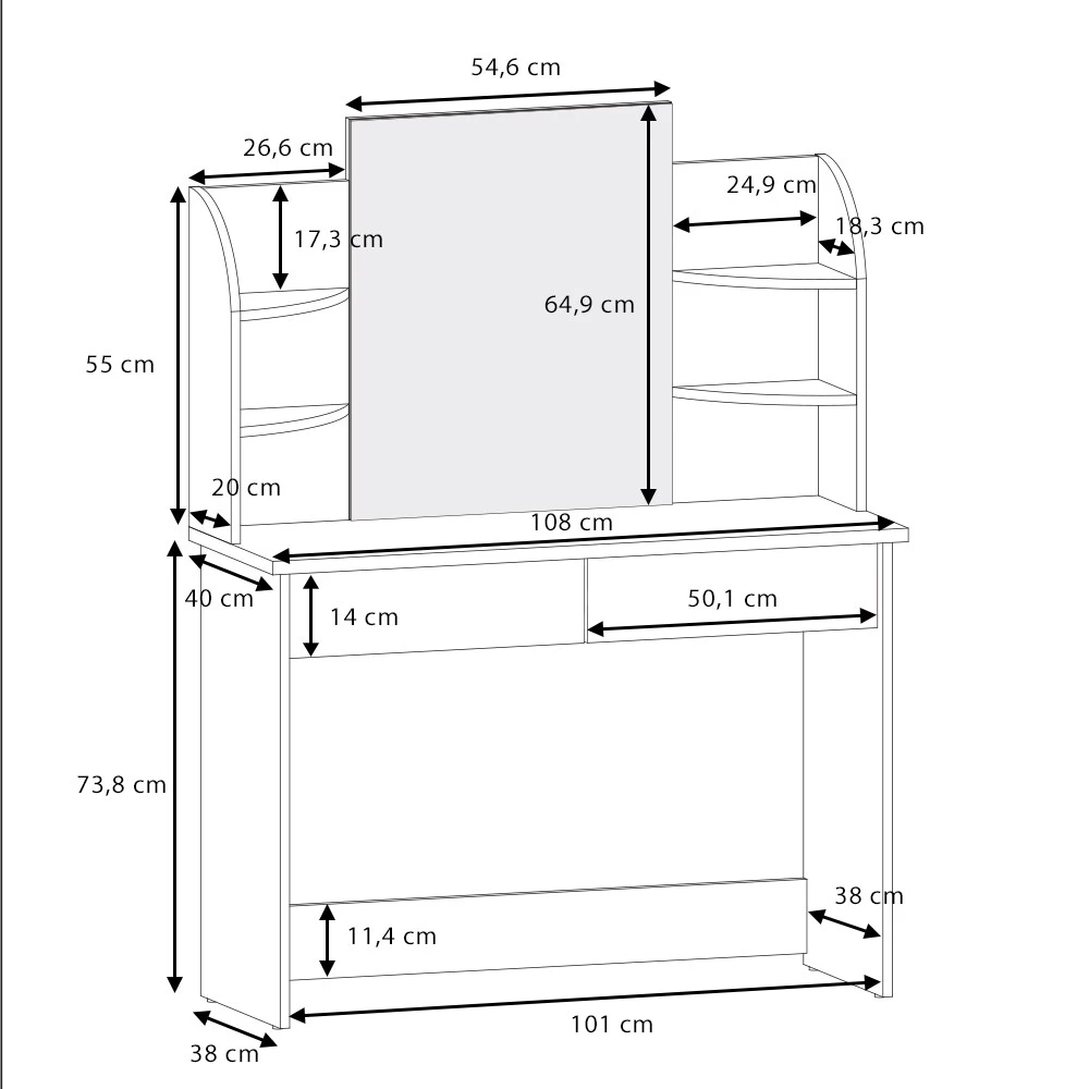 Schminktisch: 108 x 142 x 40 cm (BxHxT)