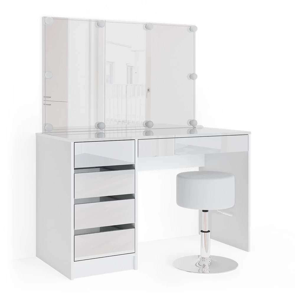 Die gradlinige Optik macht den Schminktisch zu einem stilsicheren Möbelstück, das jeden Raum aufwertet. Hochwertige Verarbeitung, bis hin zum Hochglanzeffekt, runden das Gesamtkunstwerk ab.