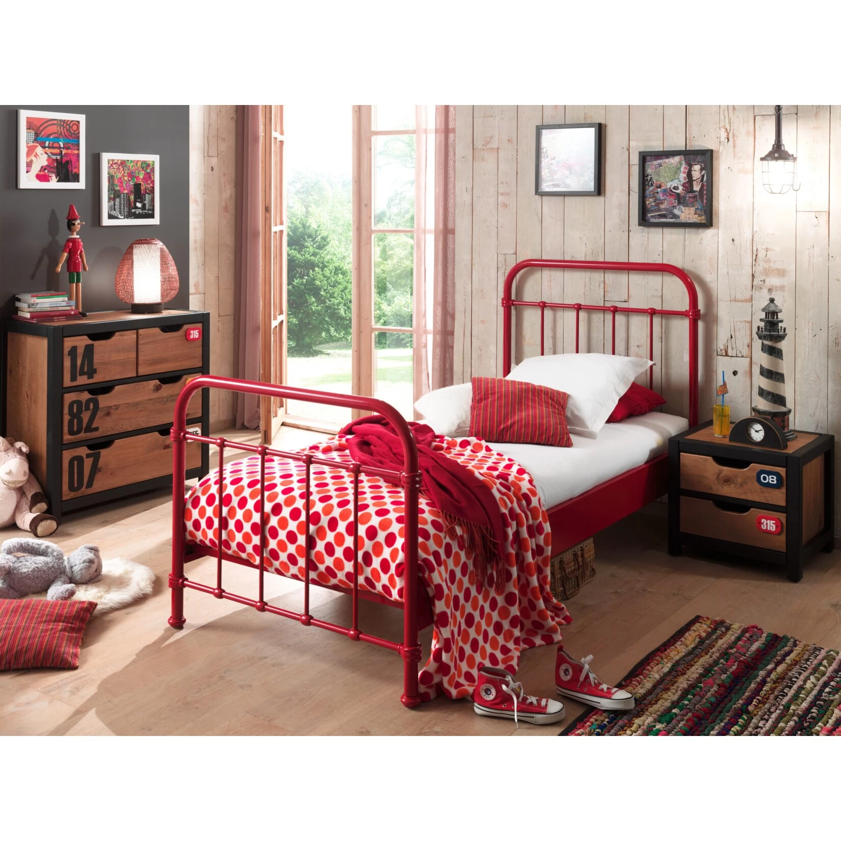 Die hochwertige Oberfläche ist Pulverbeschichtet in der Farbe Rot. Der Rohrrahmen ist 38 mm stark und verleiht dem Bett eine hohe Standfestigkeit und Stabilität. Das Kopf- und Fußteil mit den waagerecht und senkrecht verlaufenden Streben ist bereits montiert. Die breiten Bettseiten (15 cm hoch) ermöglichen eine Einlegetiefe von 11 cm für die Matratze.
