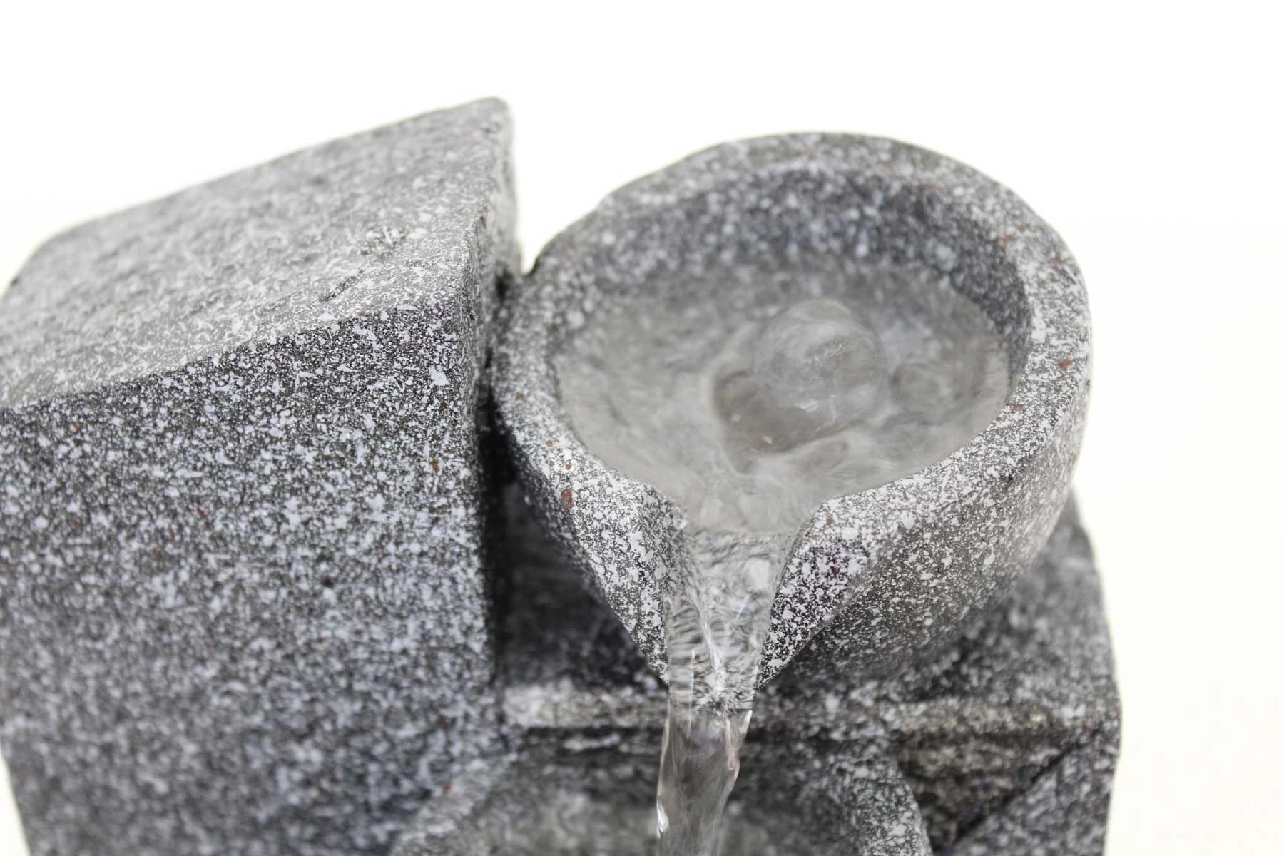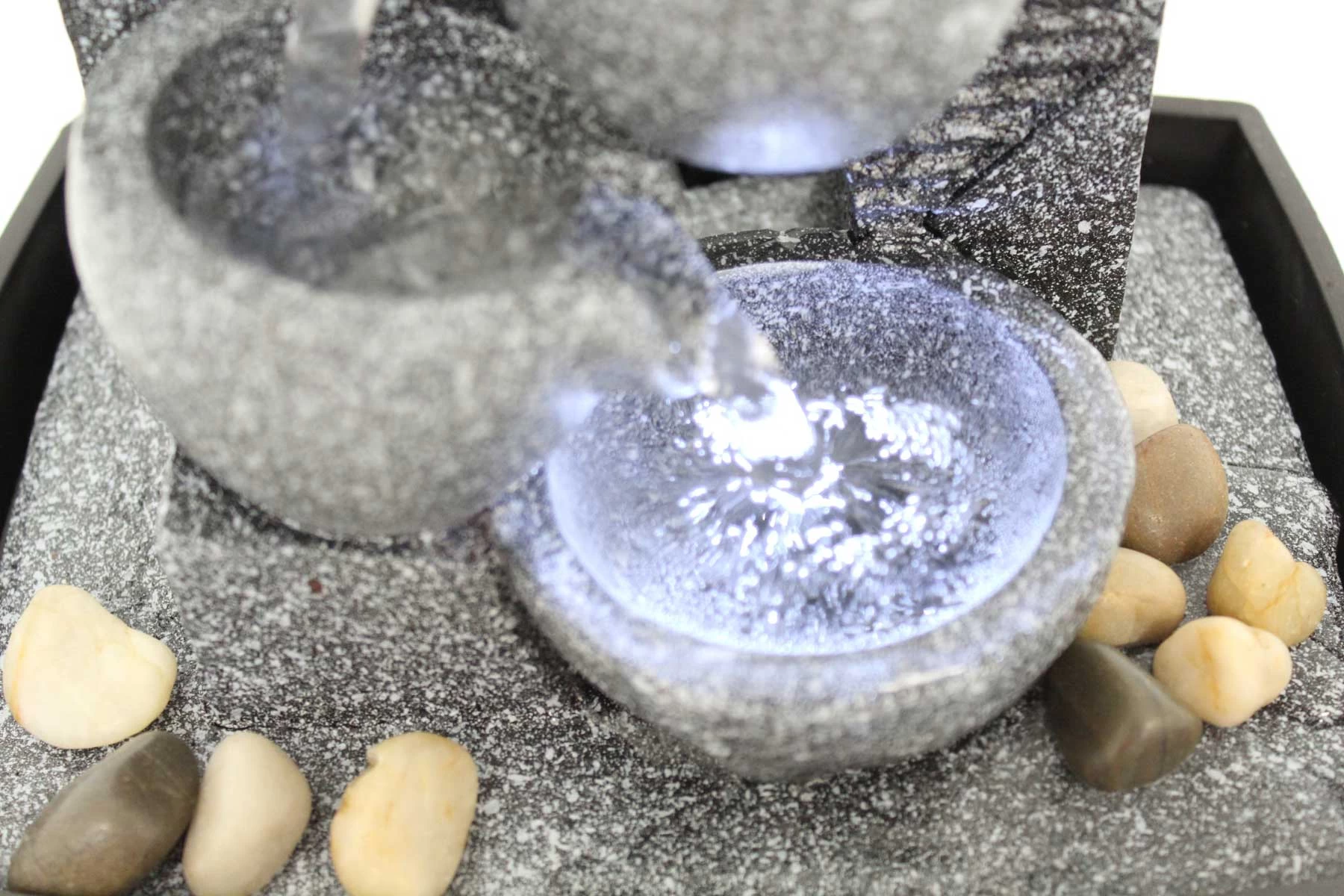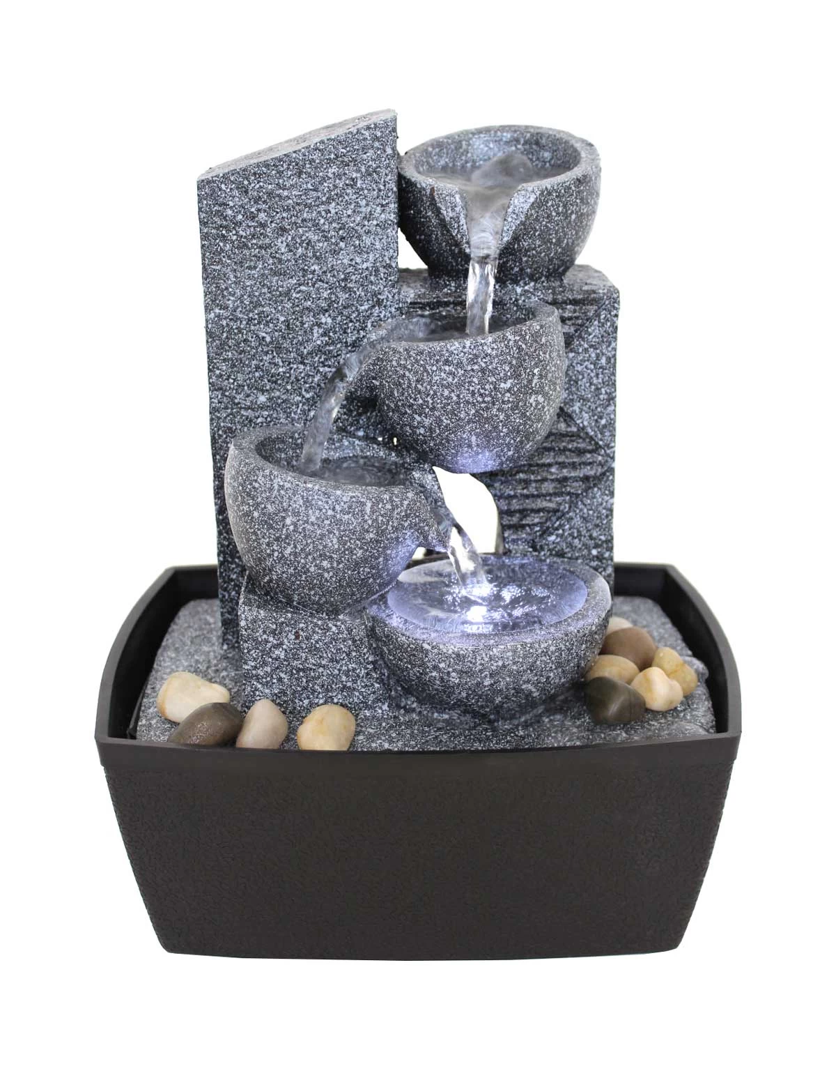 - Das in der unteren Schale stehende Wasser wird durch die integrierte LED durchleuchtet, was ein spannendes Lichtspiel ergibt.